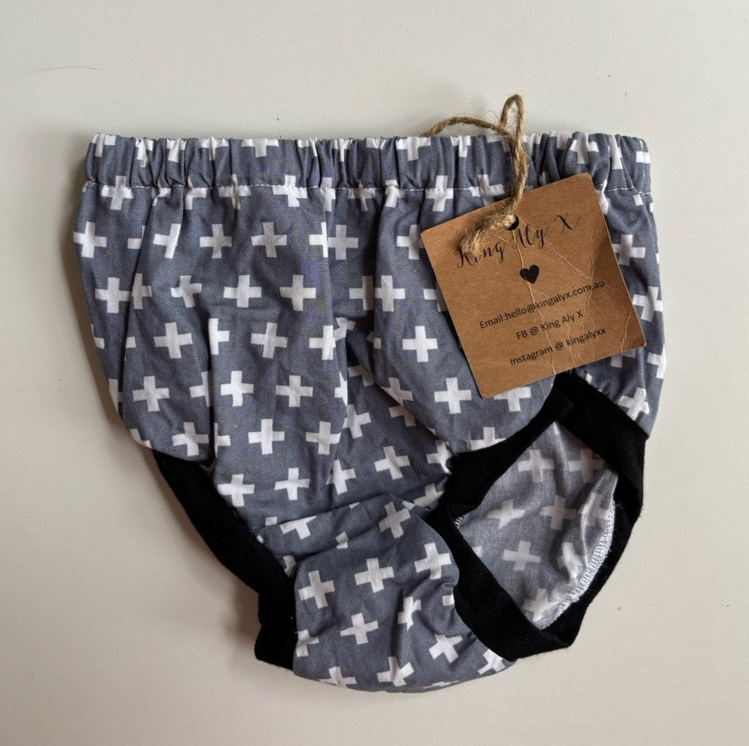 King Aly X baby size 3-6 months blue white cross bloomers handmade, BN
