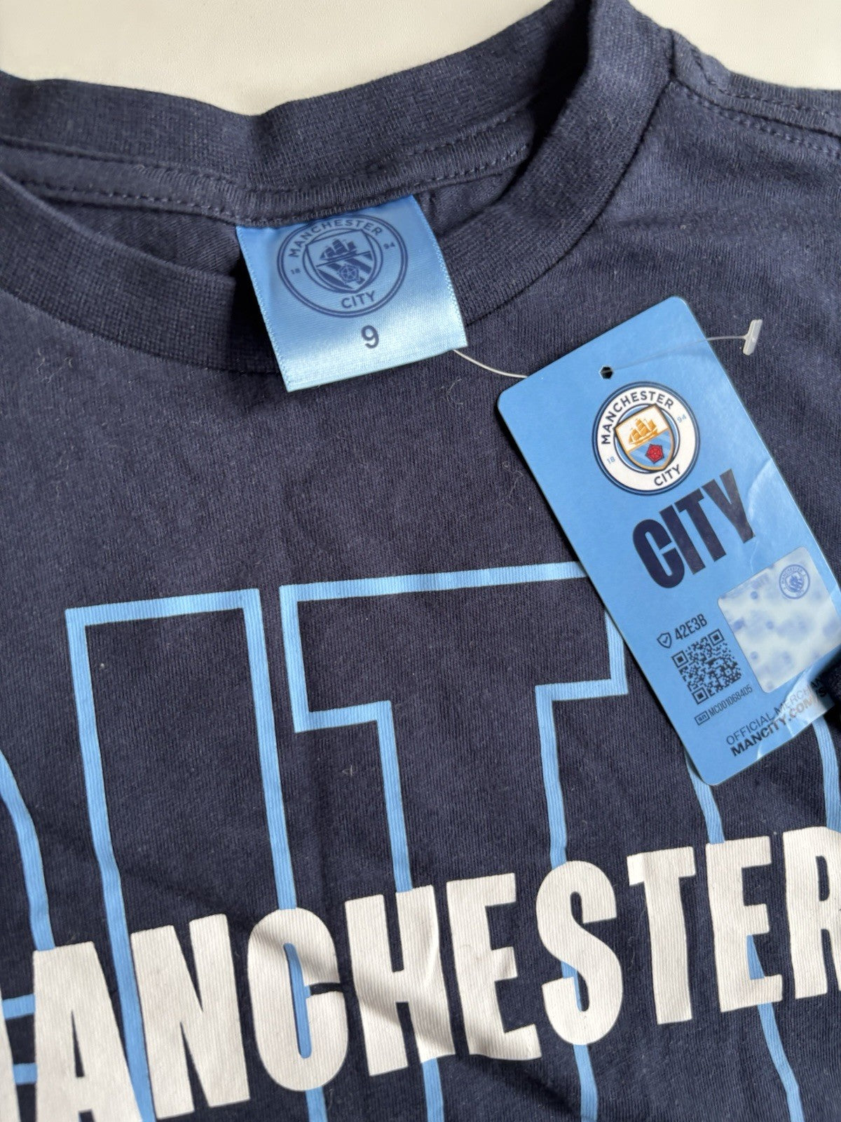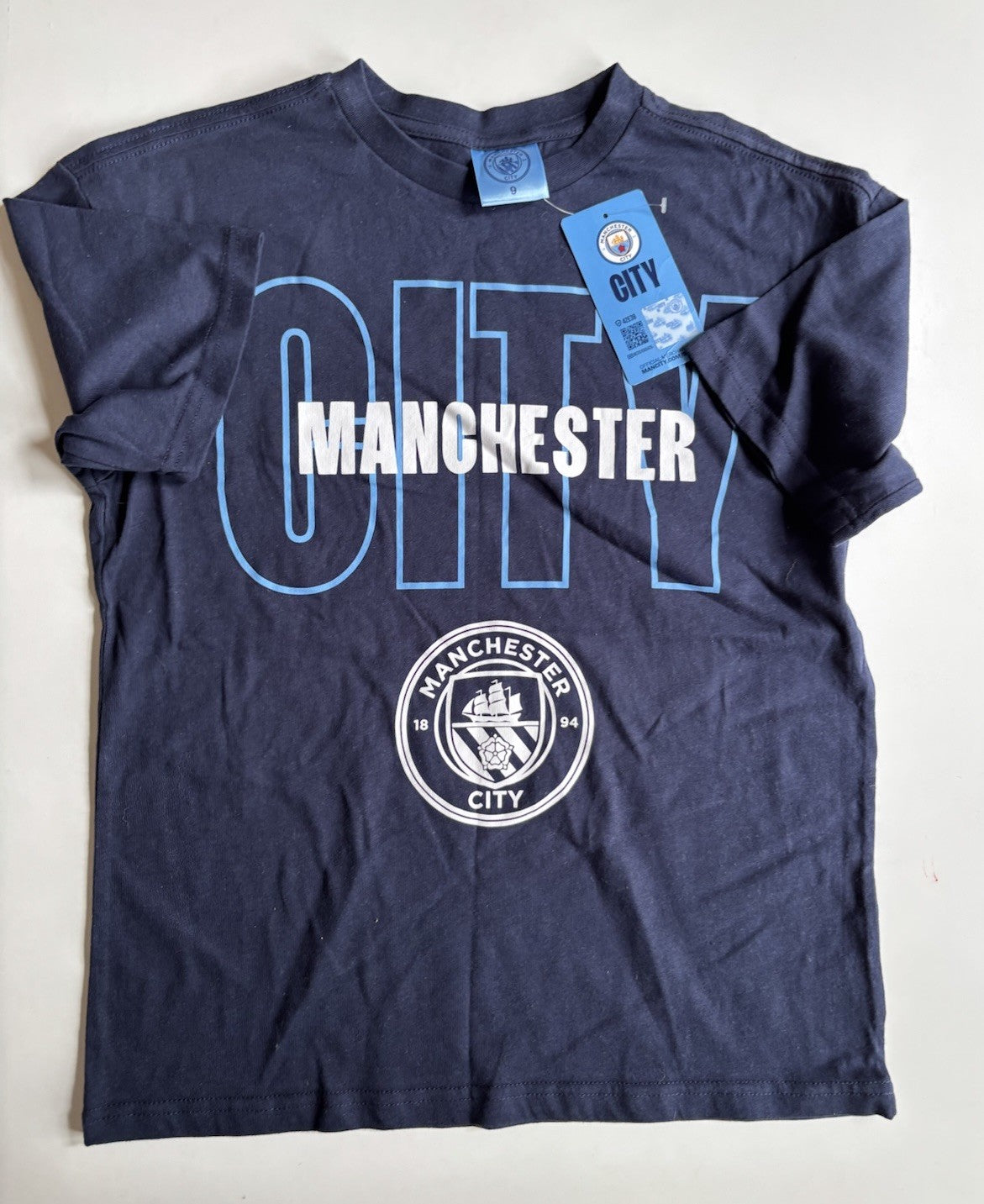 Manchester City FC kids size 9 navy blue soccer short sleeve t-shirt, BNWT