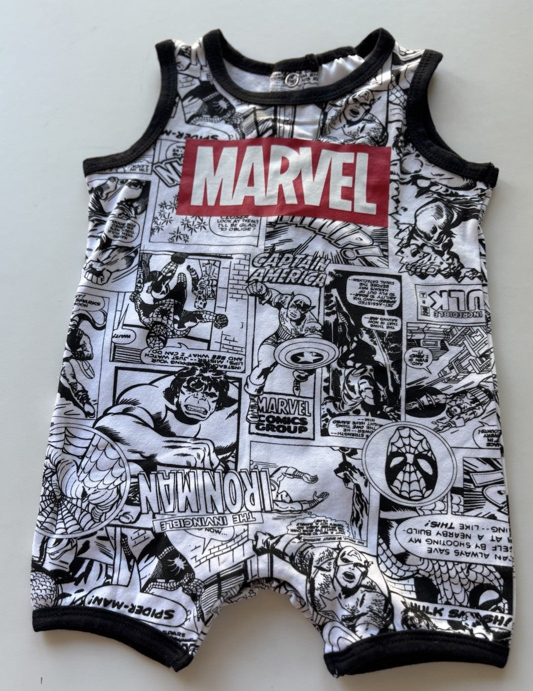 Marvel baby boy size 0-3 months black white logo romper, BNWT