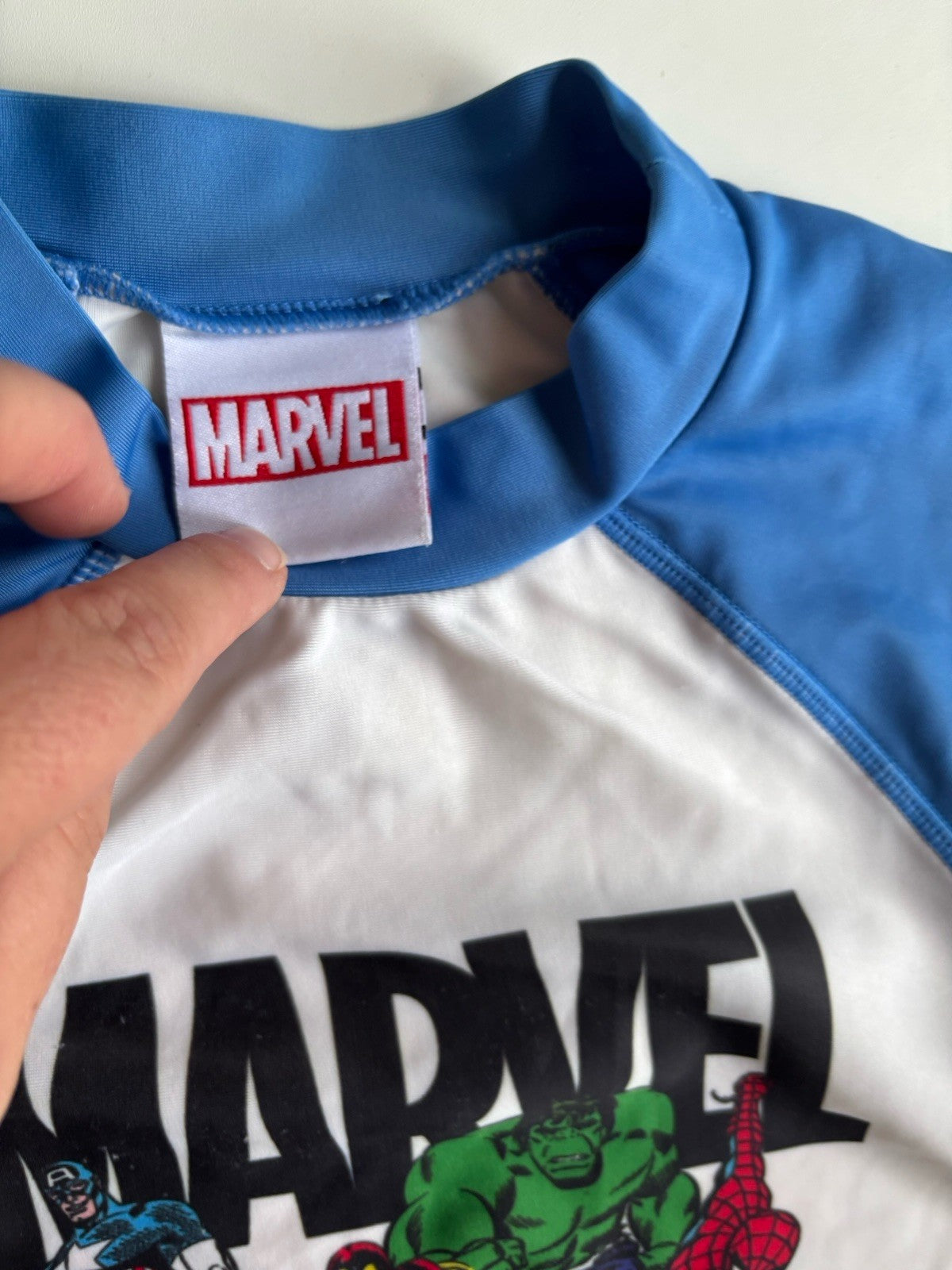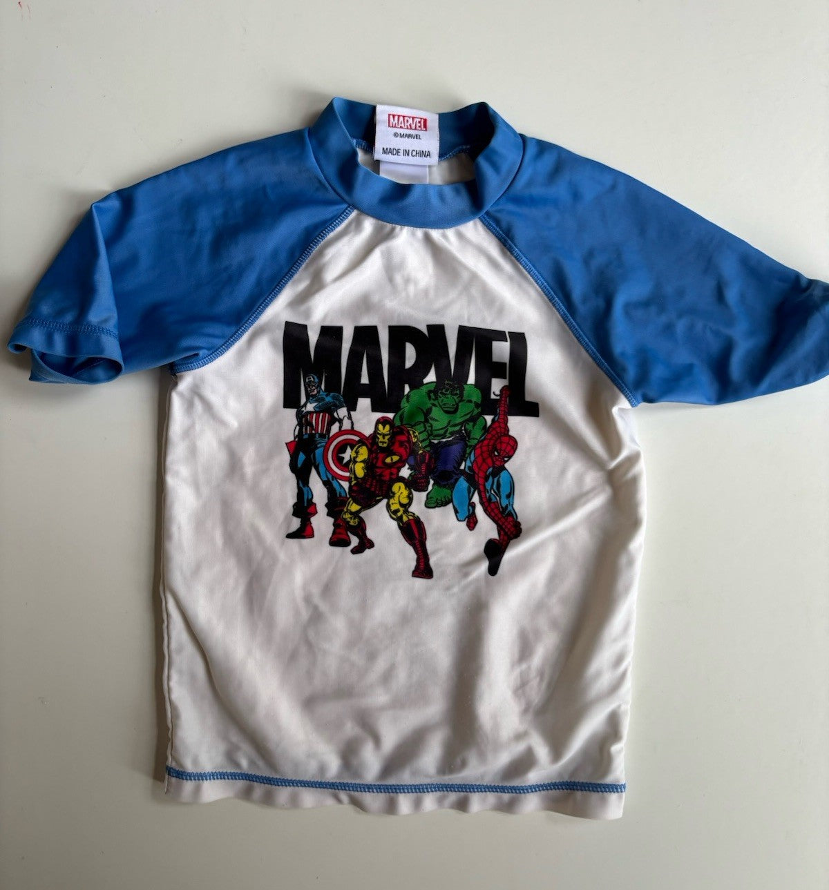 Marvel kids boys size 4 blue white characters rash vest swimwear, VGUC