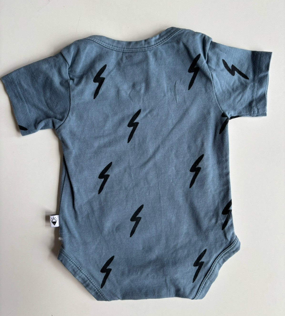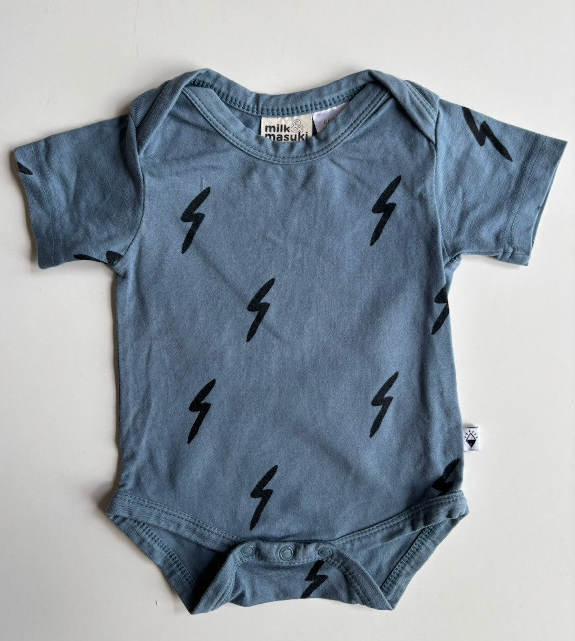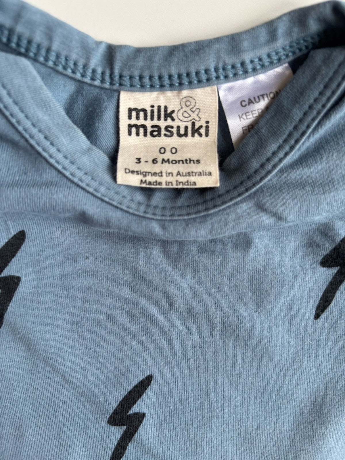 Milk & Masuki baby size 3-6 months blue lightning strike bodysuit, VGU