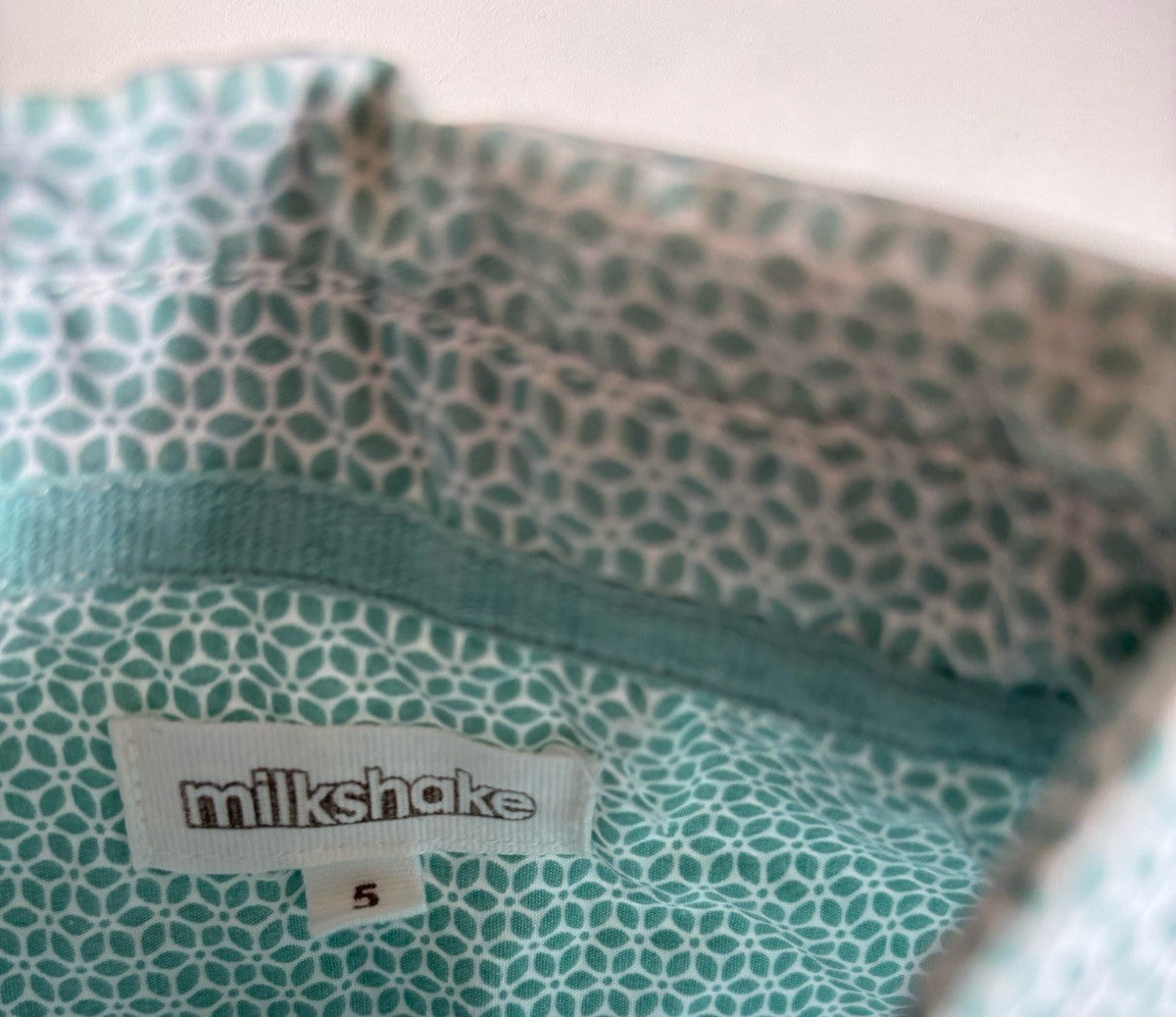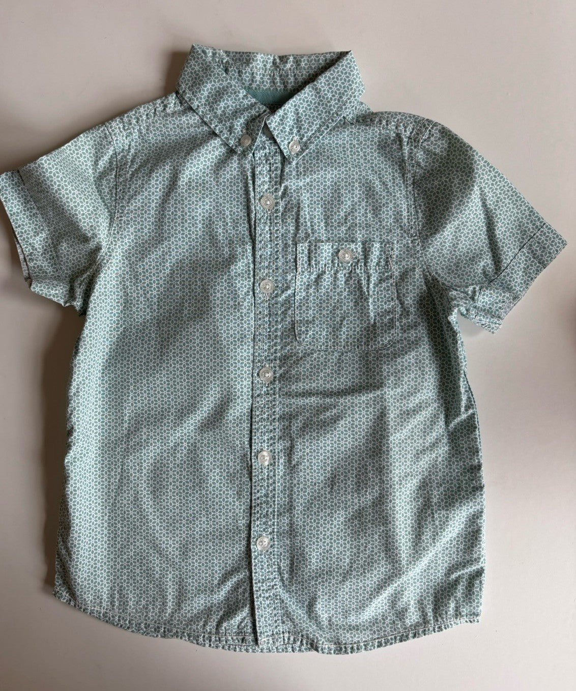 Milkshake kids boys size 5 green white patterned short sleeve shirt, VGUC