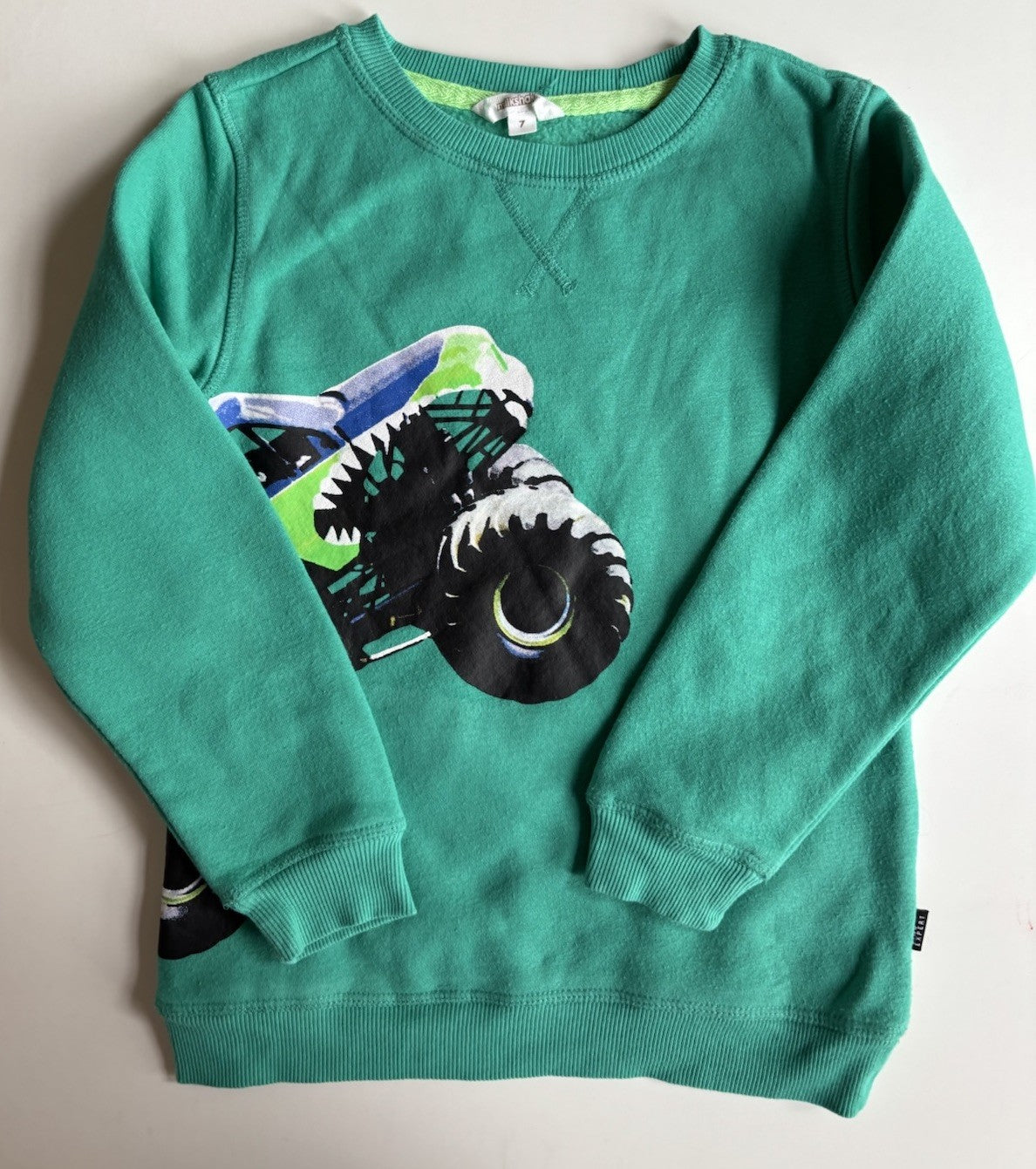 Milkshake kids boys size 7 green monster truck pullover jumper, VGUC