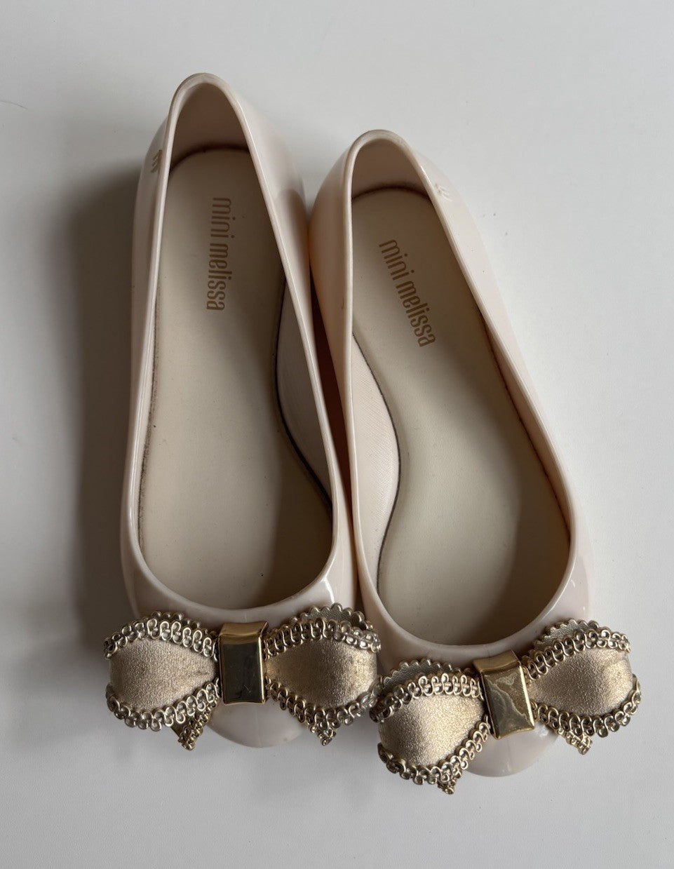 Mini Melissa kids girls size US 13/EUR 31 cream gold bow flat shoes, VGUC