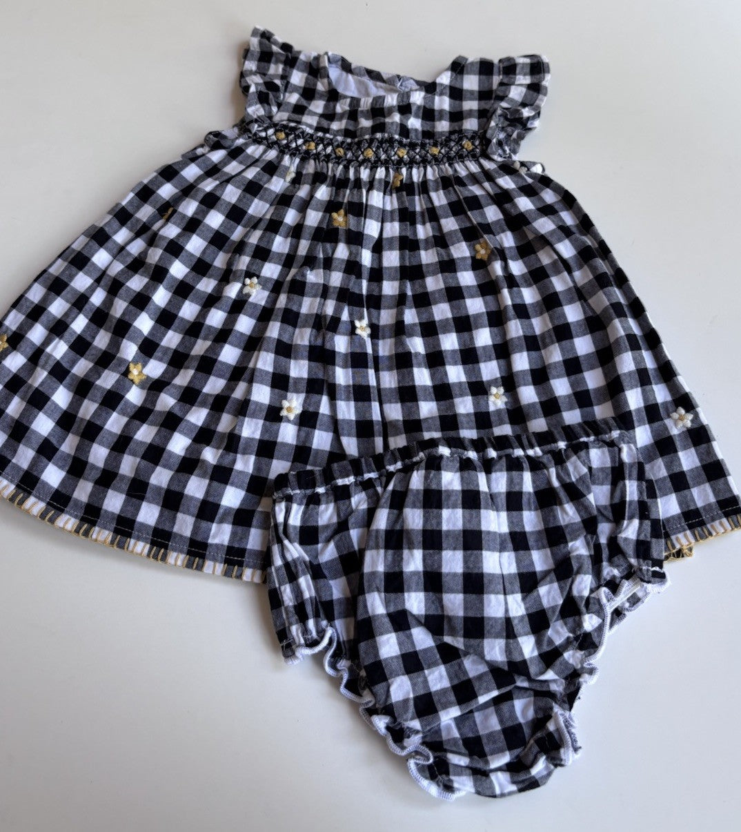 Next baby girl size 0-3 months black gingham smocked floral dress, VGU
