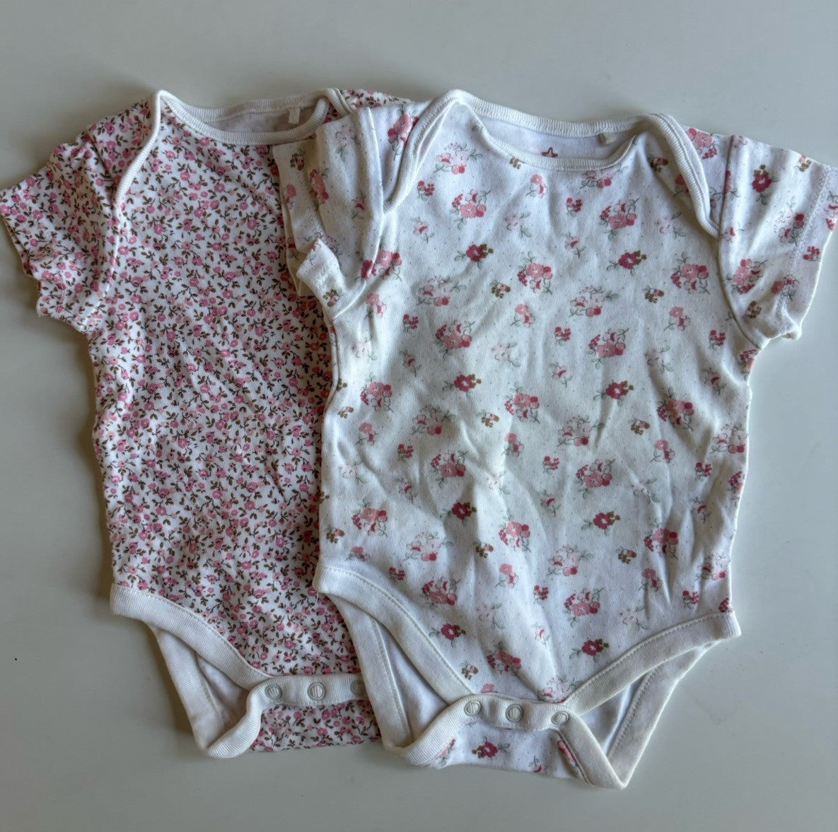 Next baby girl size 3-6 months x2 pink white floral bodysuit tops, VGUC