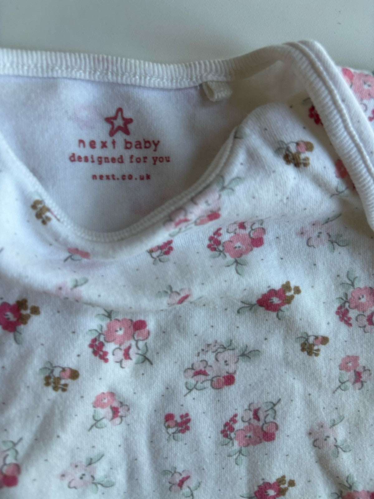 Next baby girl size 3-6 months x2 pink white floral bodysuit tops, VGU