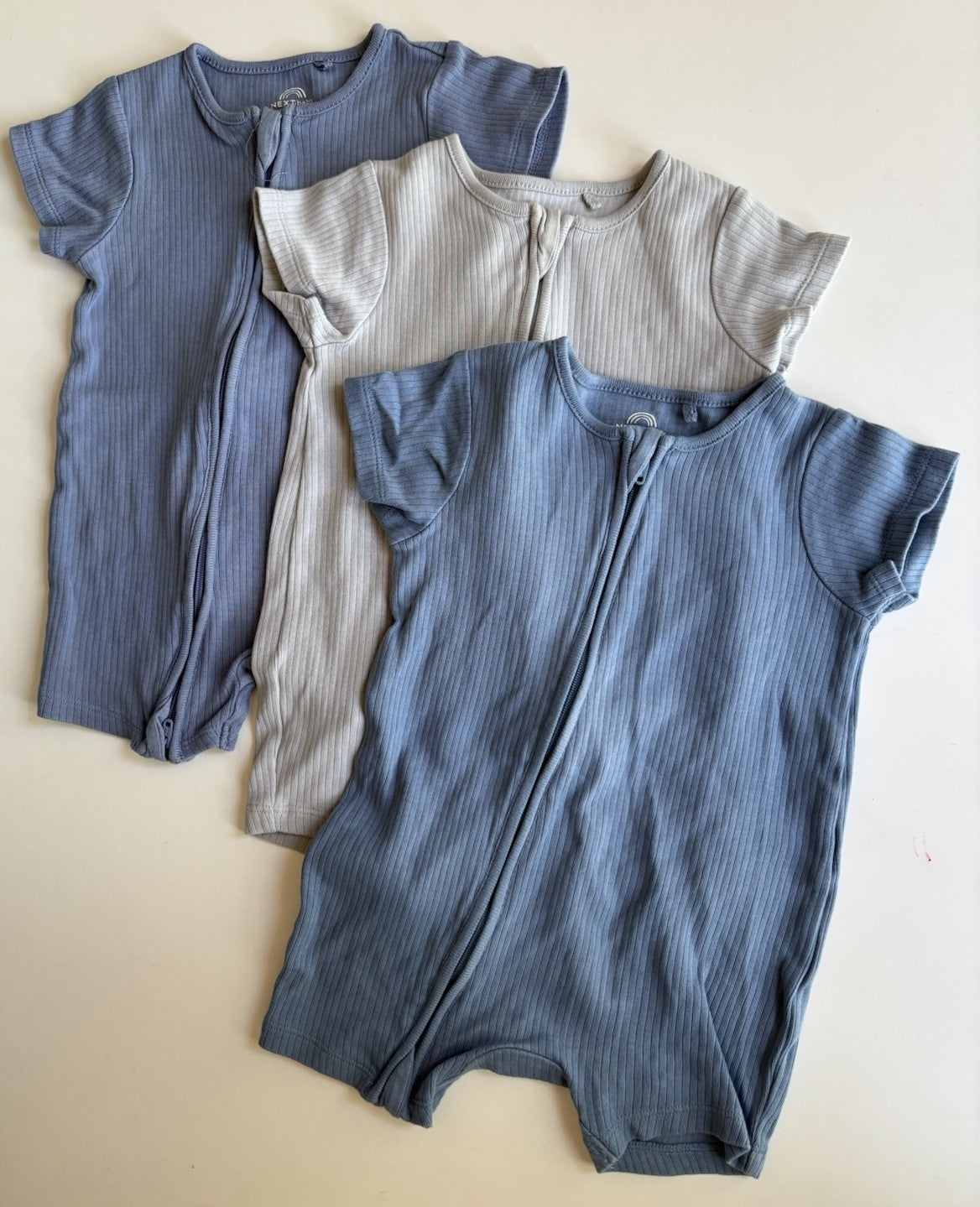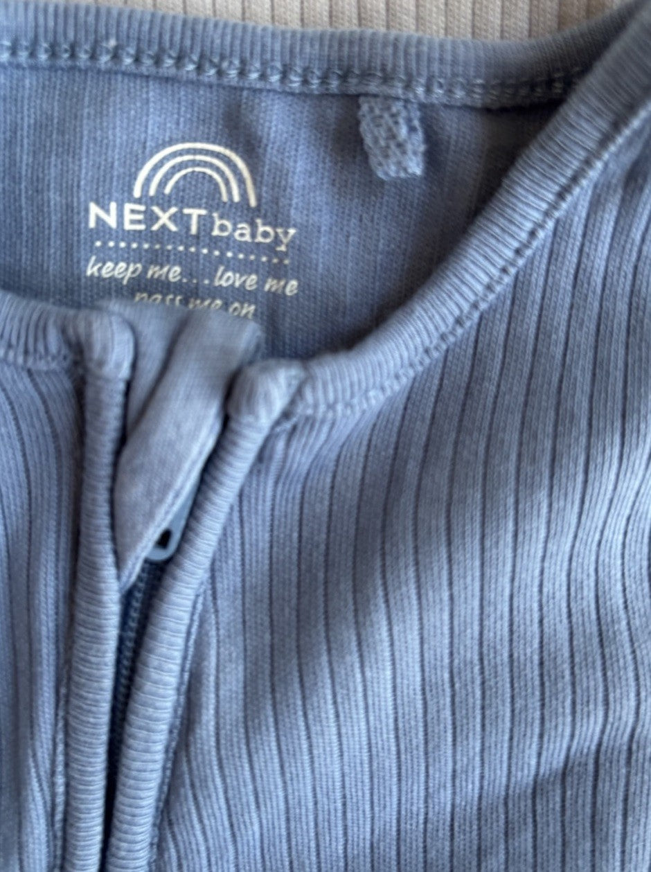 Next baby size 6-9 months x3 blue ribbed romper one-piece zip, VGUC