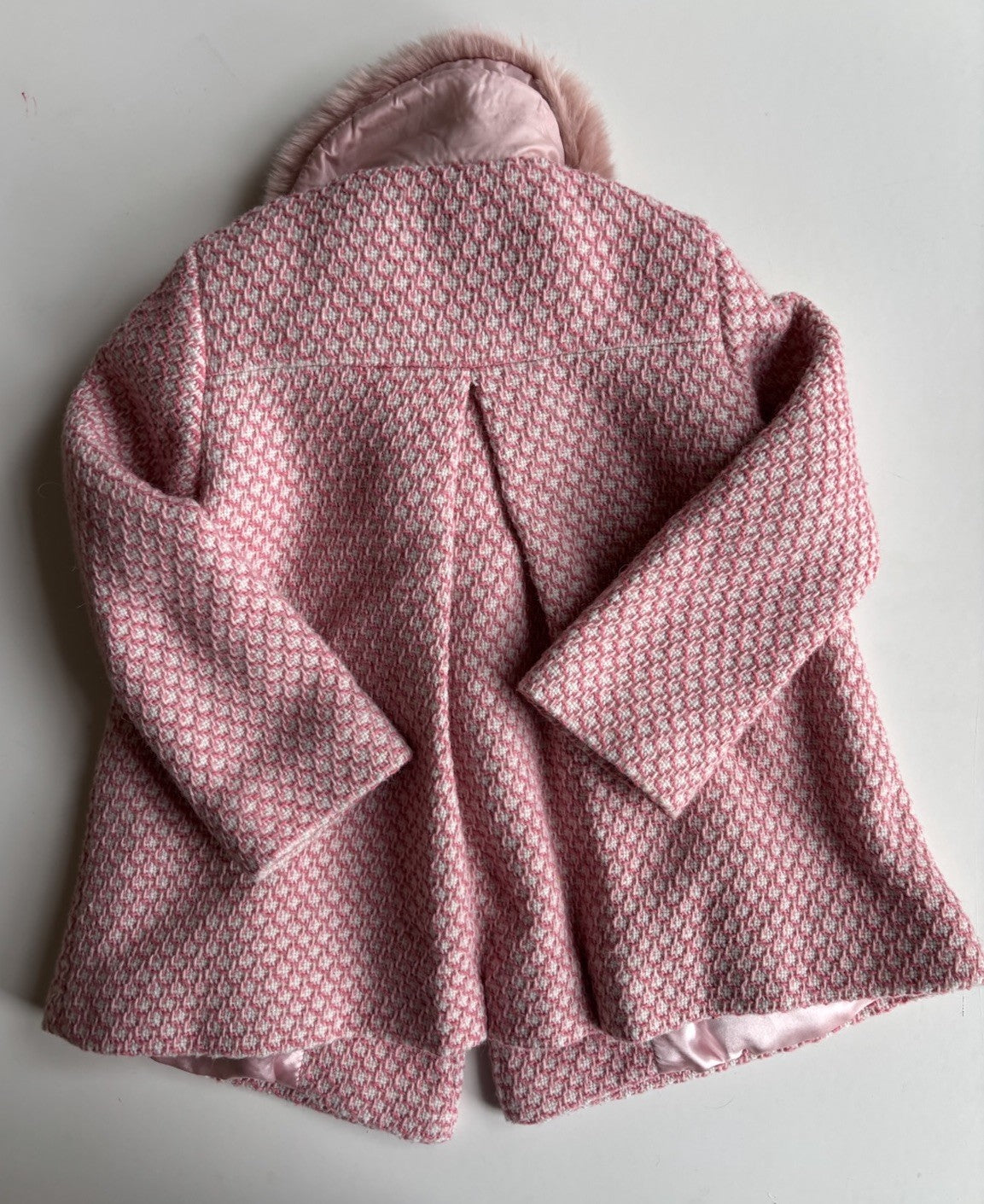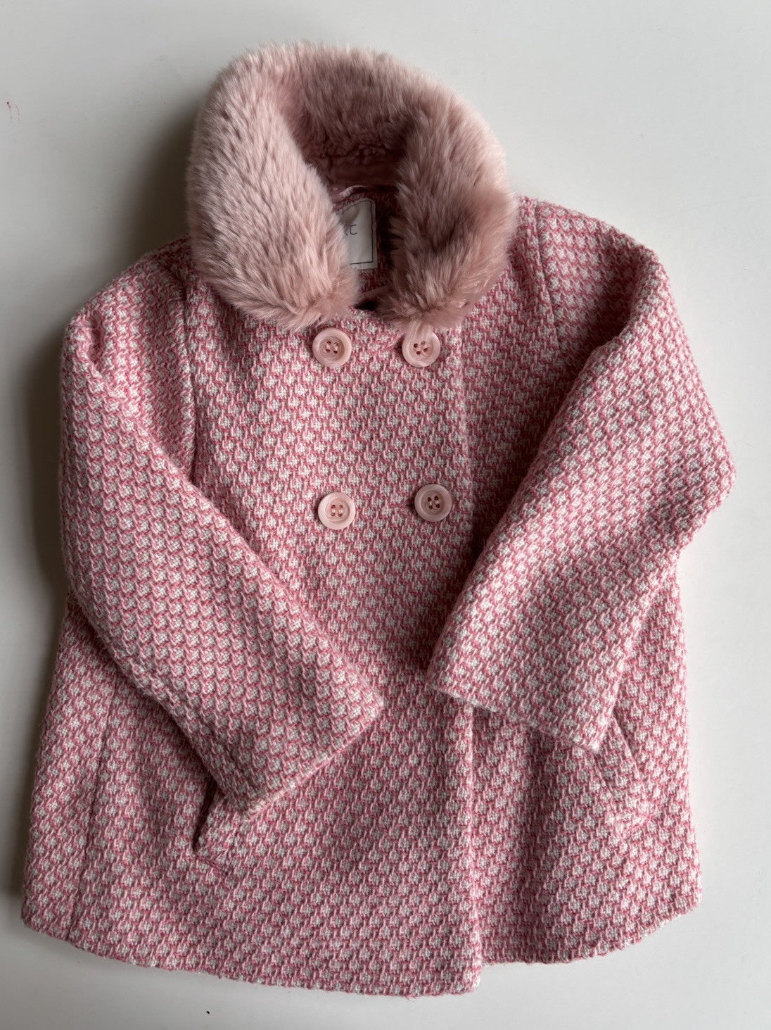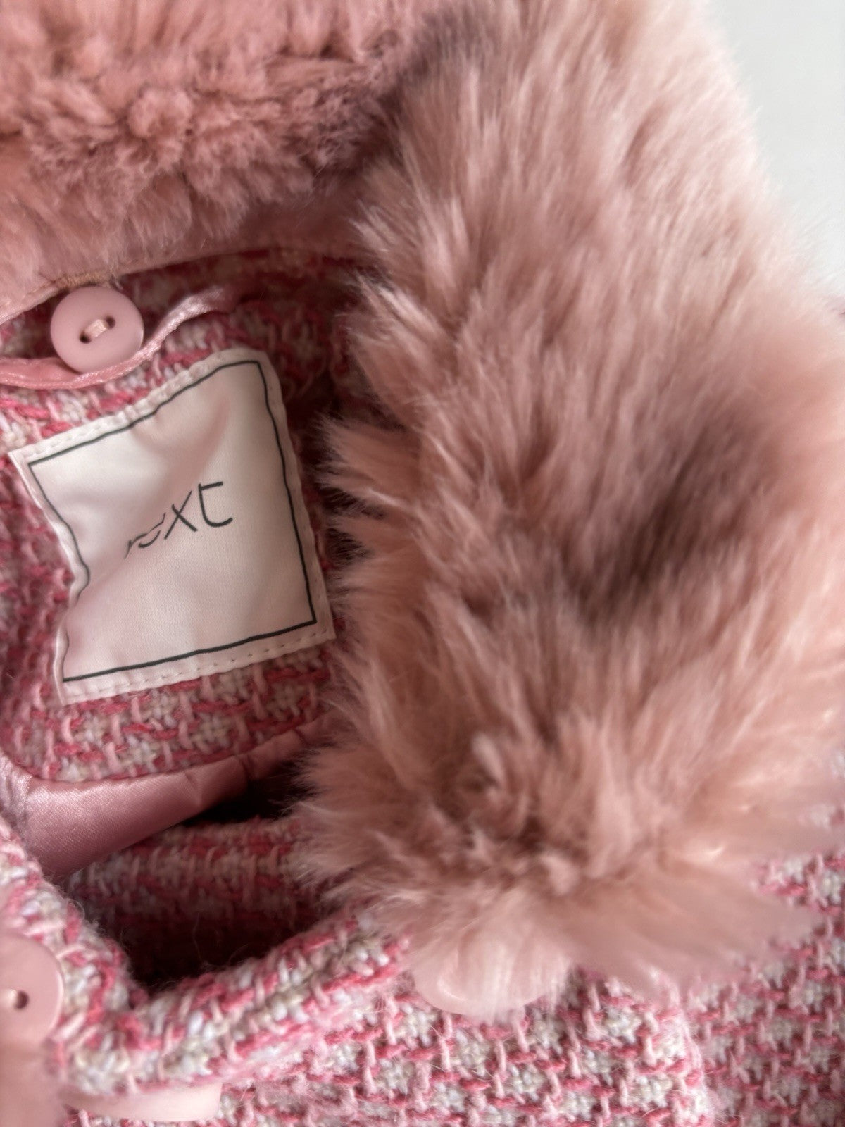 Next kids girls size 3-4 years pink white pattern knit fluffy collared coat VGUC