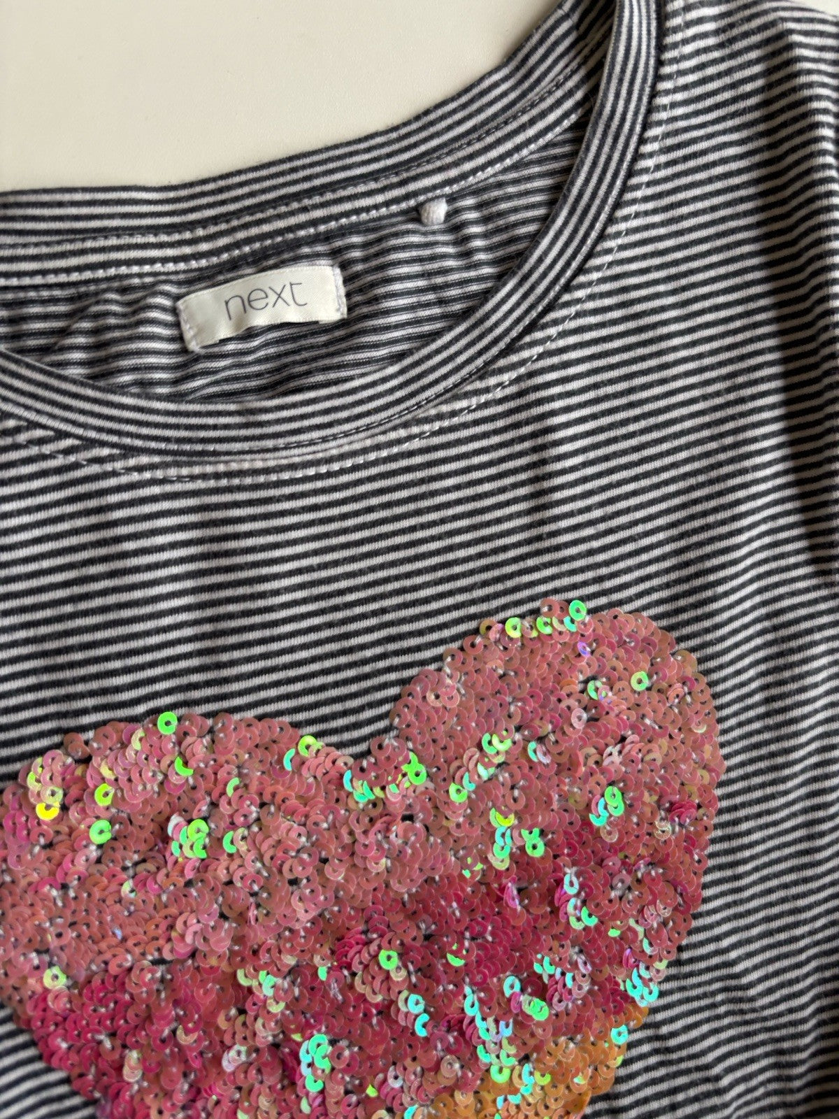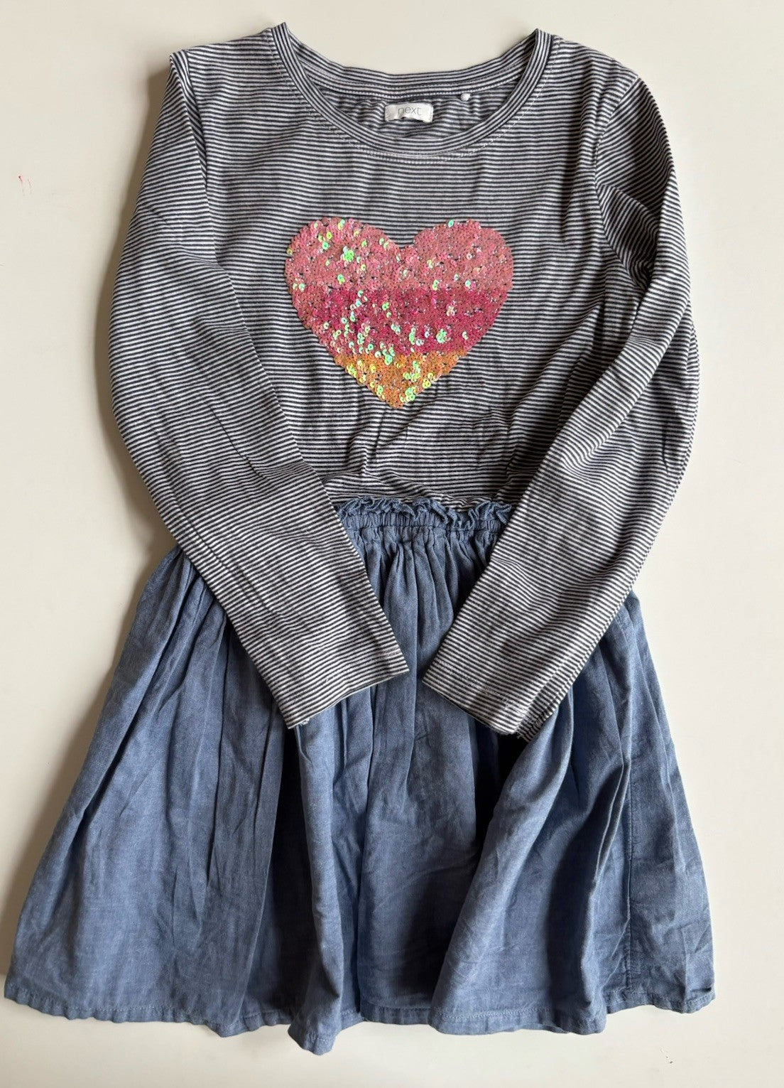 Next kids girls size 8 years blue stripe pink sequin heart dress, VGUC