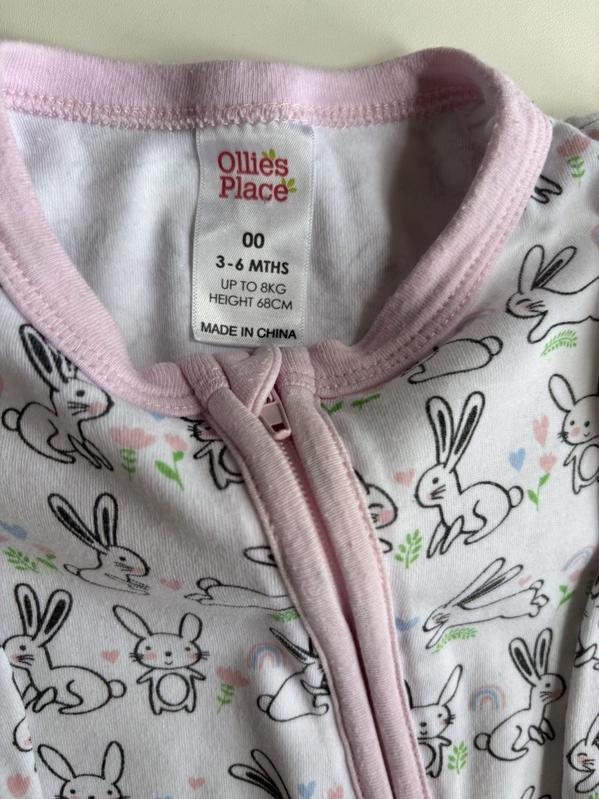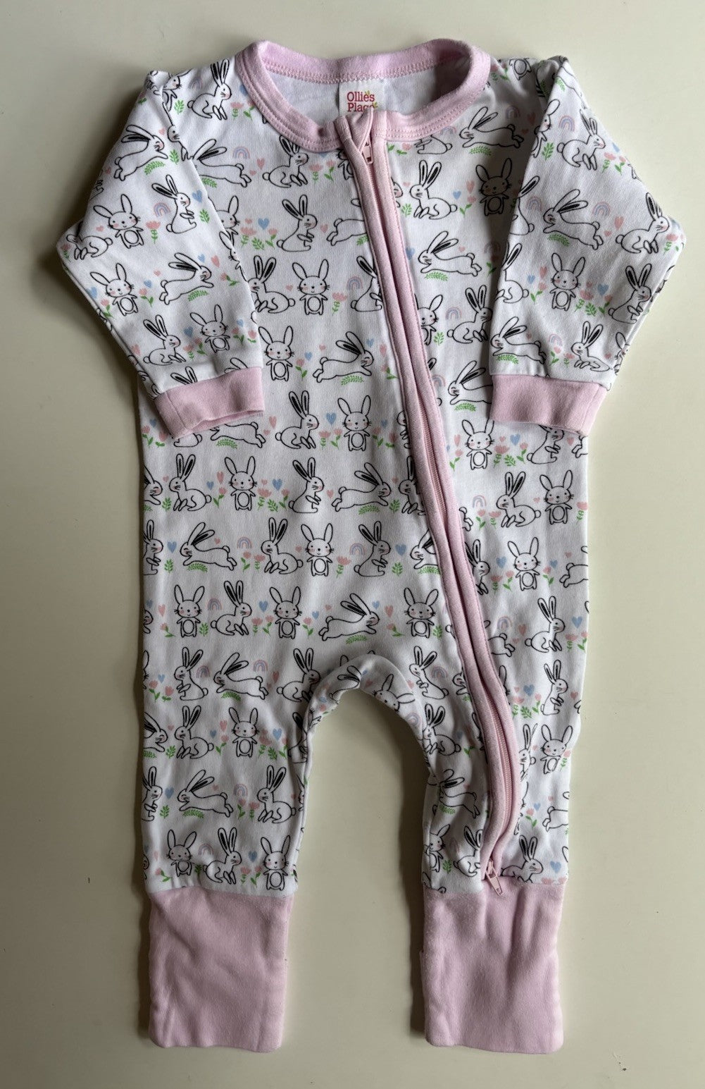 Ollie's Place baby girl size 3-6 months white pink bunnies one-piece,