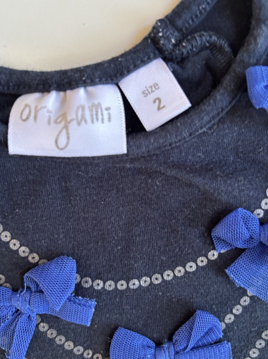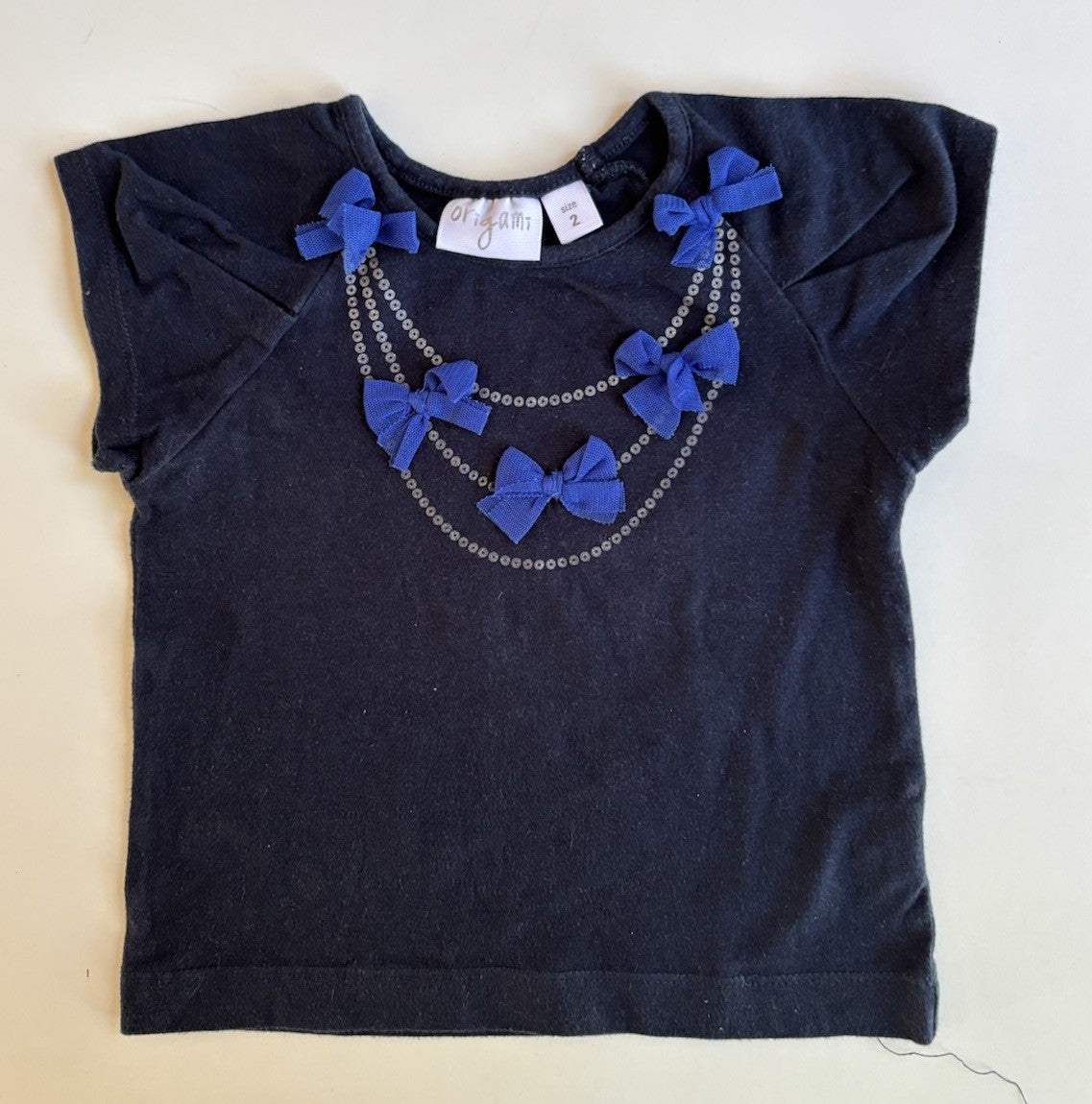 Origami kids girls toddler size 2 navy blue bows short sleeve t-shirt, VGUC