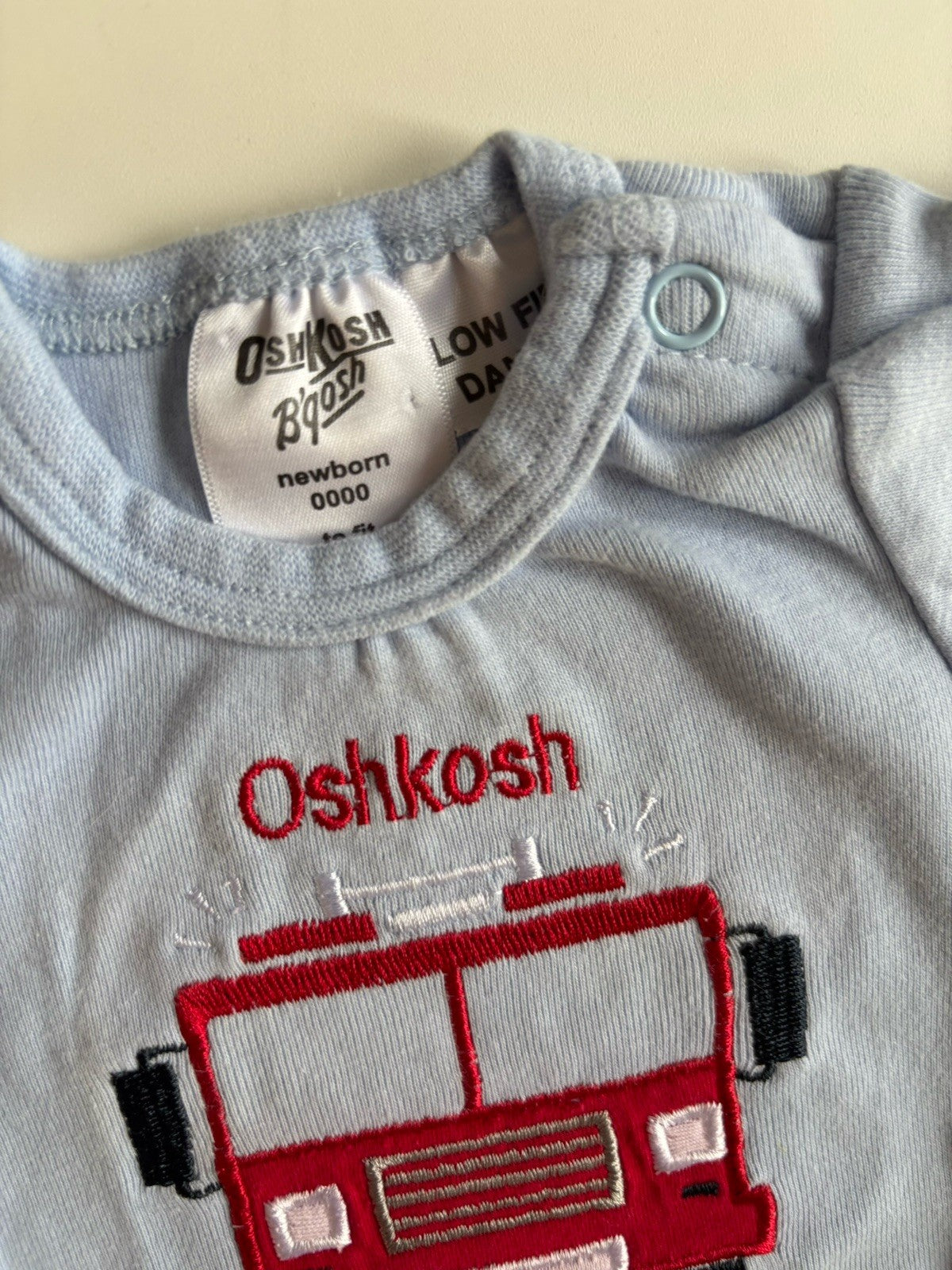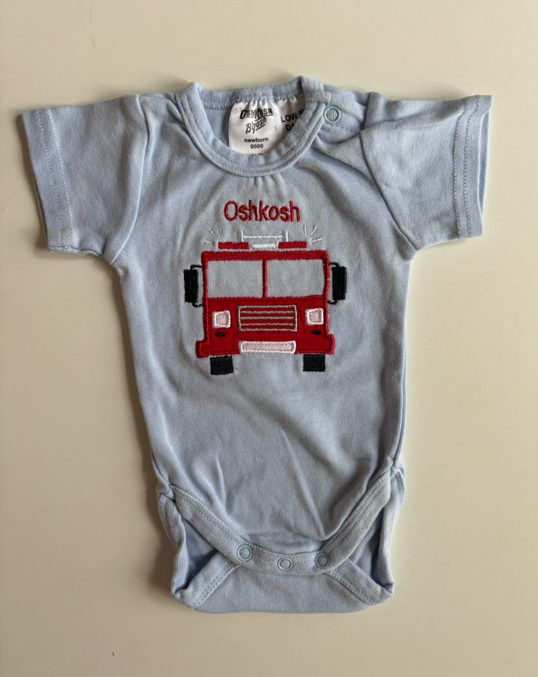 Osh Kosh B'gosh baby boy size newborn blue bodysuit fire engine, VGUC
