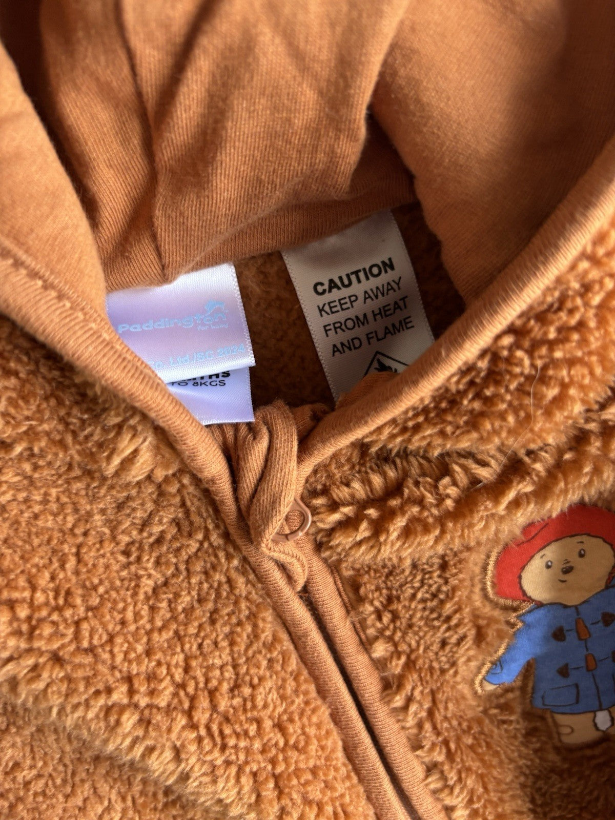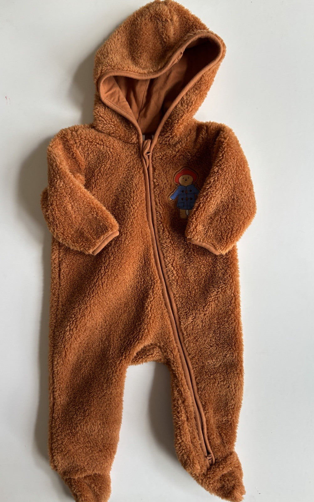 Paddington baby size 3-6 months brown fluffy hooded one-piece, VGUC