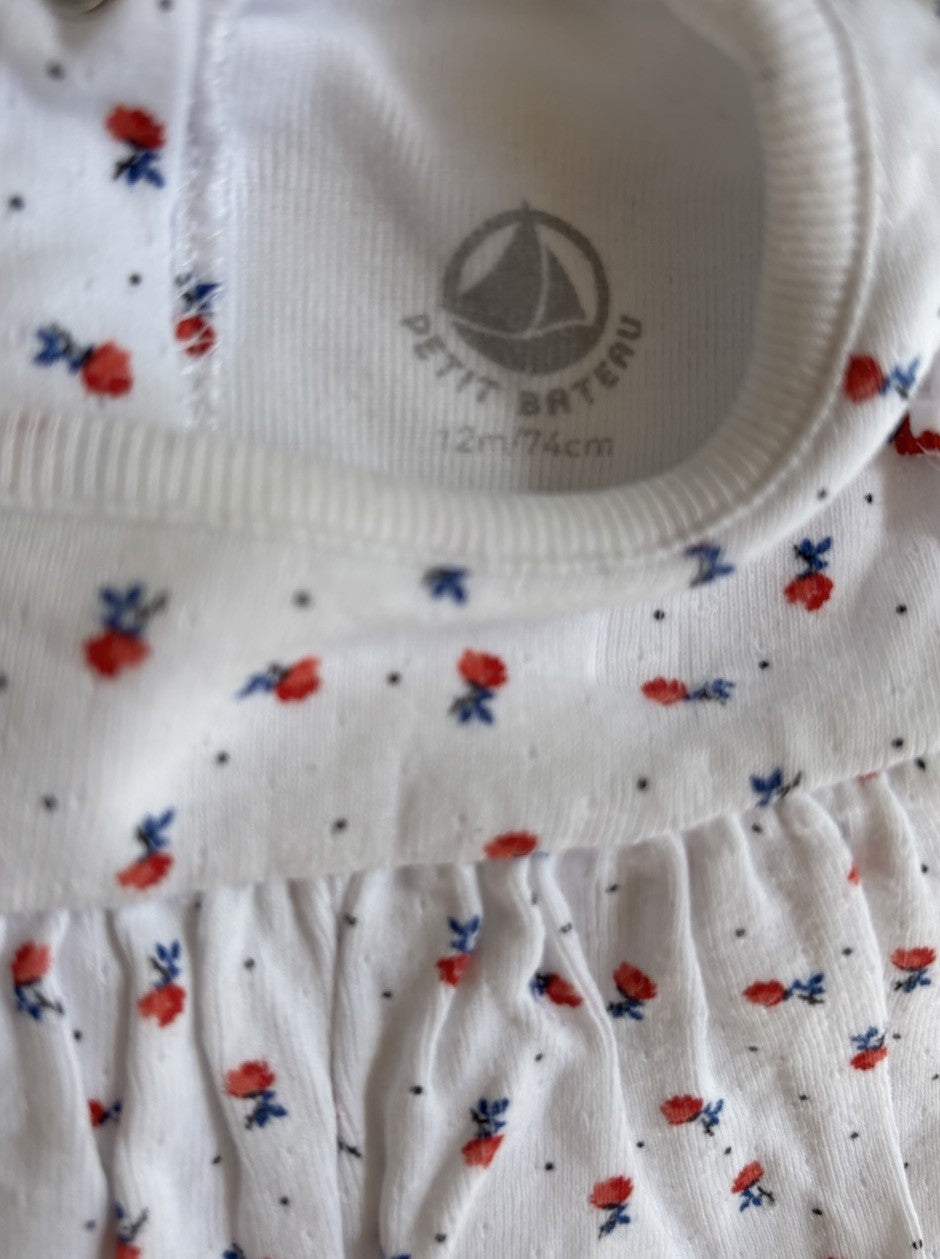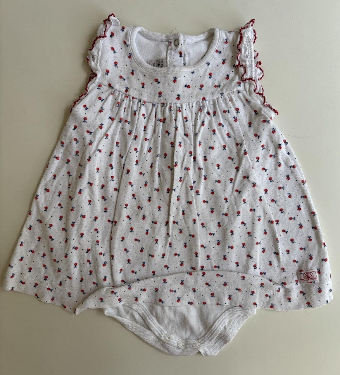 Petit Bateau baby girl size 9-12 months white red floral bodysuit dress, VGUC