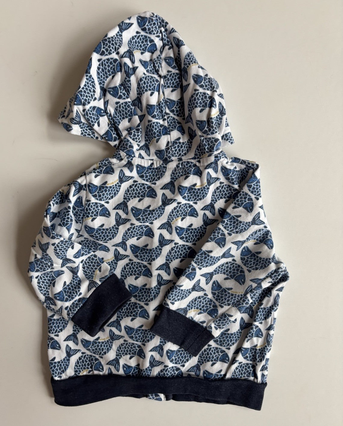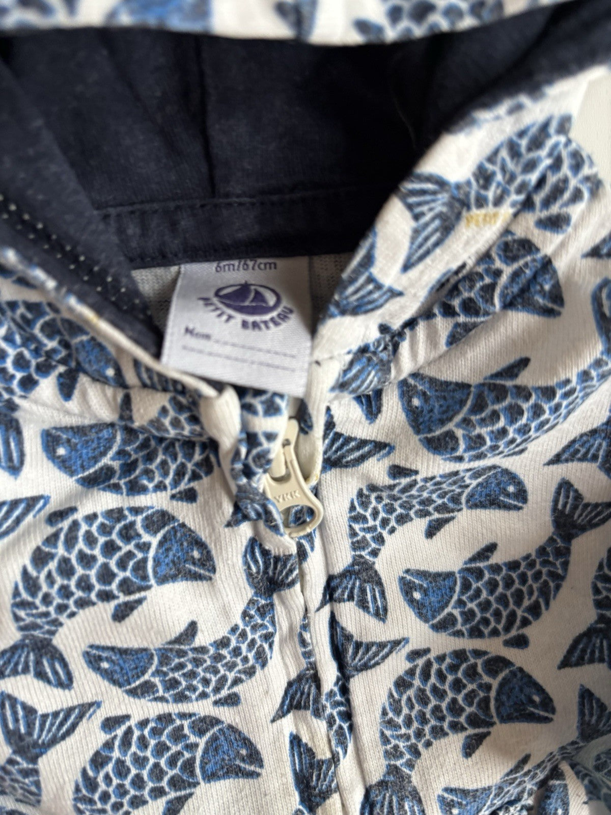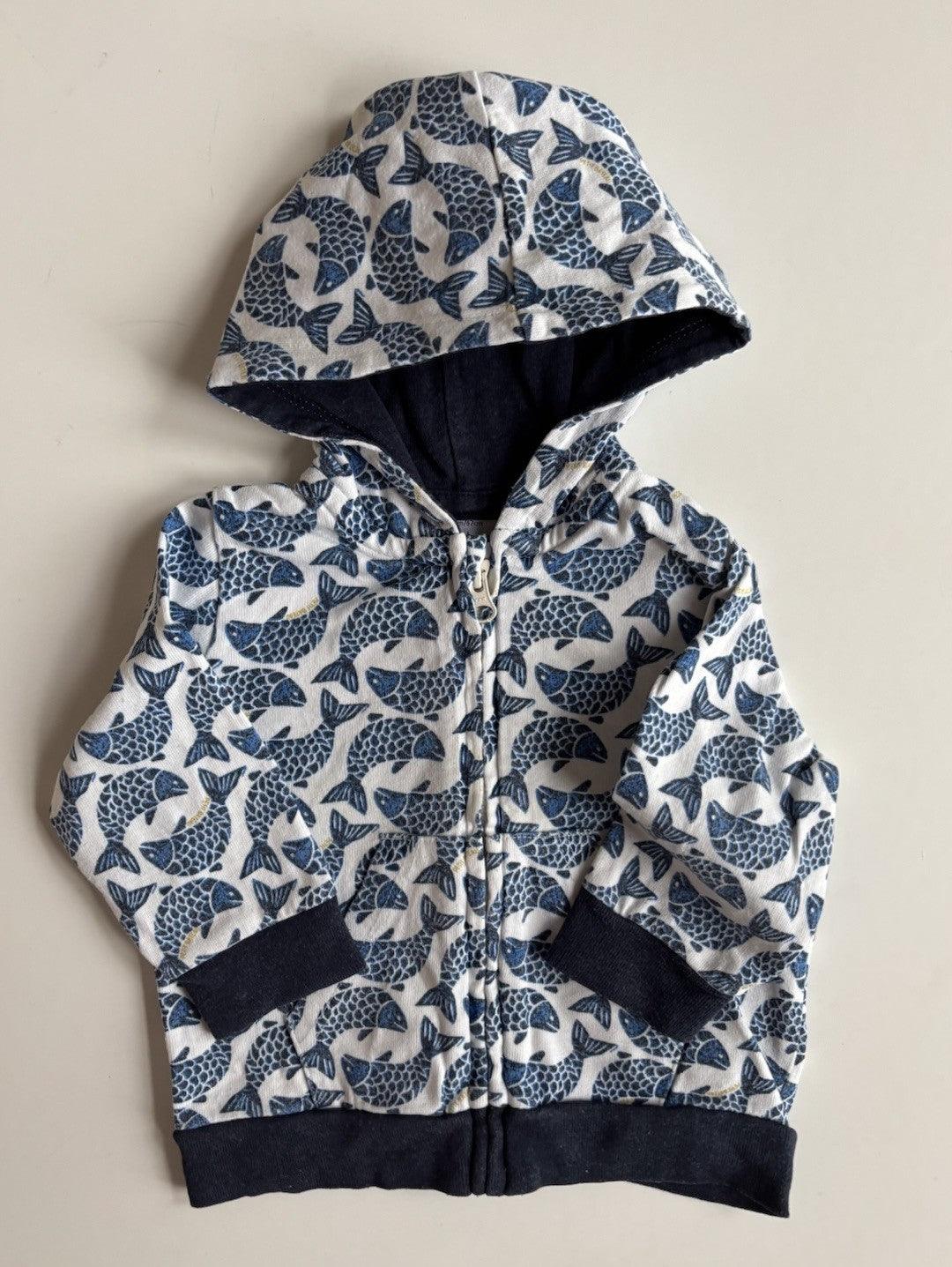 Petit Bateau baby size 3-6 months blue white fish hooded zip jumper, VGUC