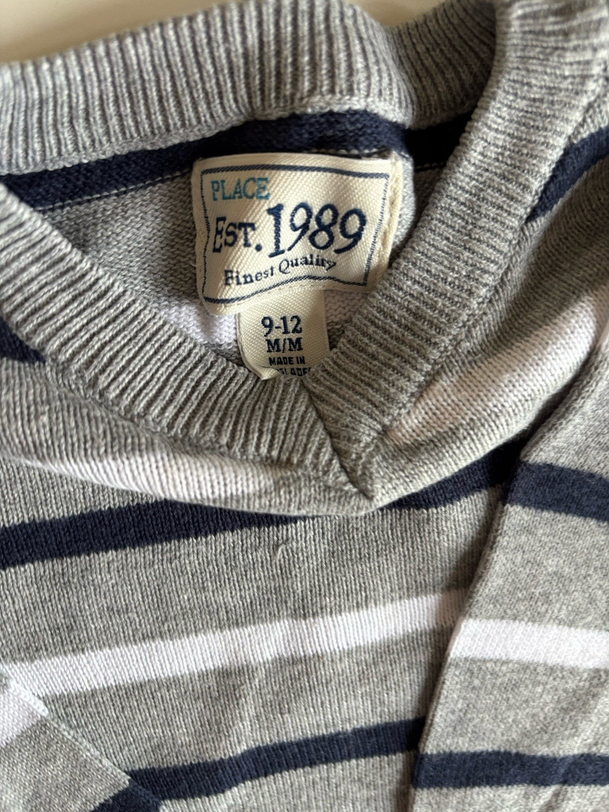 Place baby boy size 9-12 months grey blue white stripe knit jumper, VG