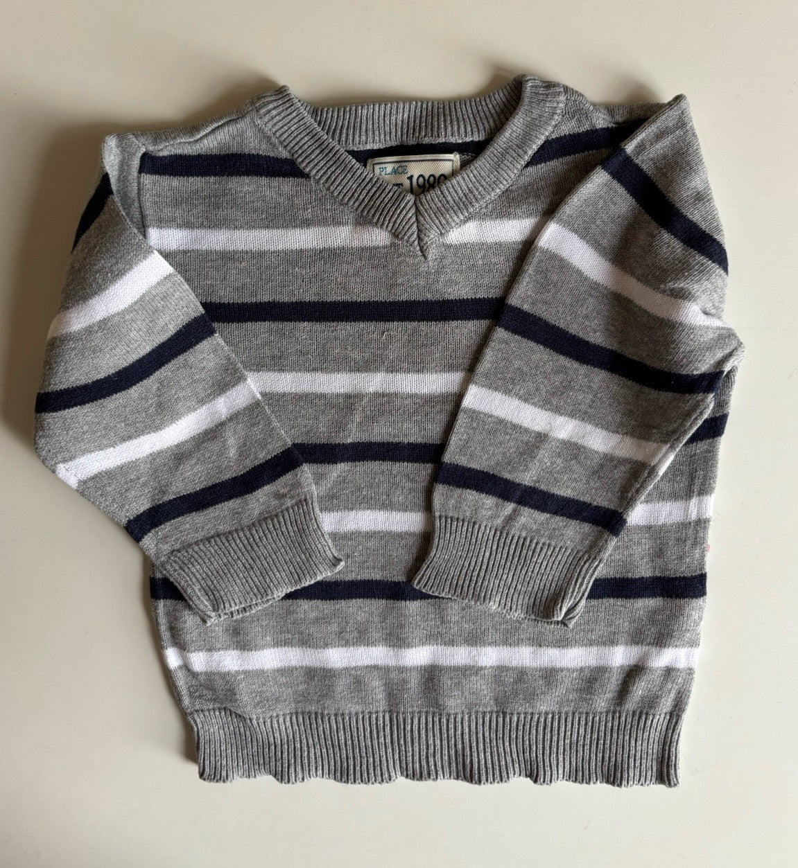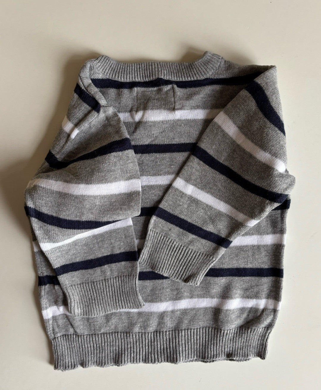 Place baby boy size 9-12 months grey blue white stripe knit jumper, VGUC