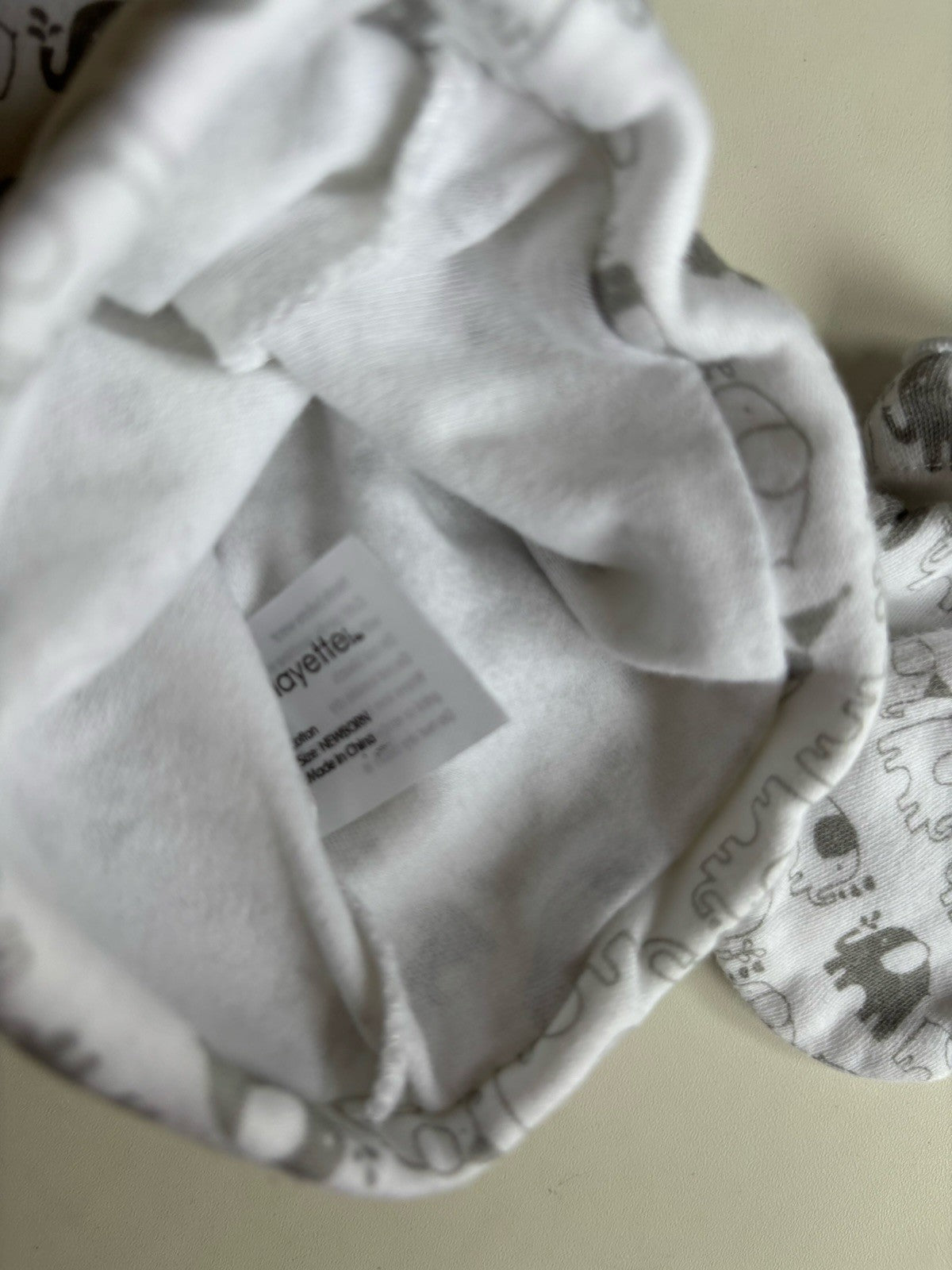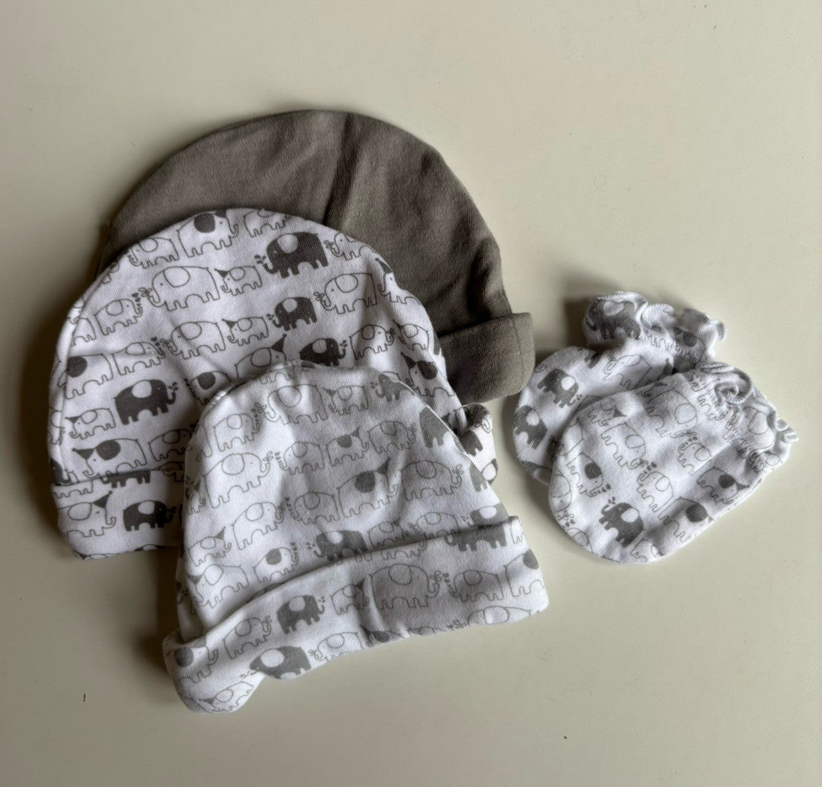 Playette baby size newborn grey white elephant beanies mittens set, VGUC