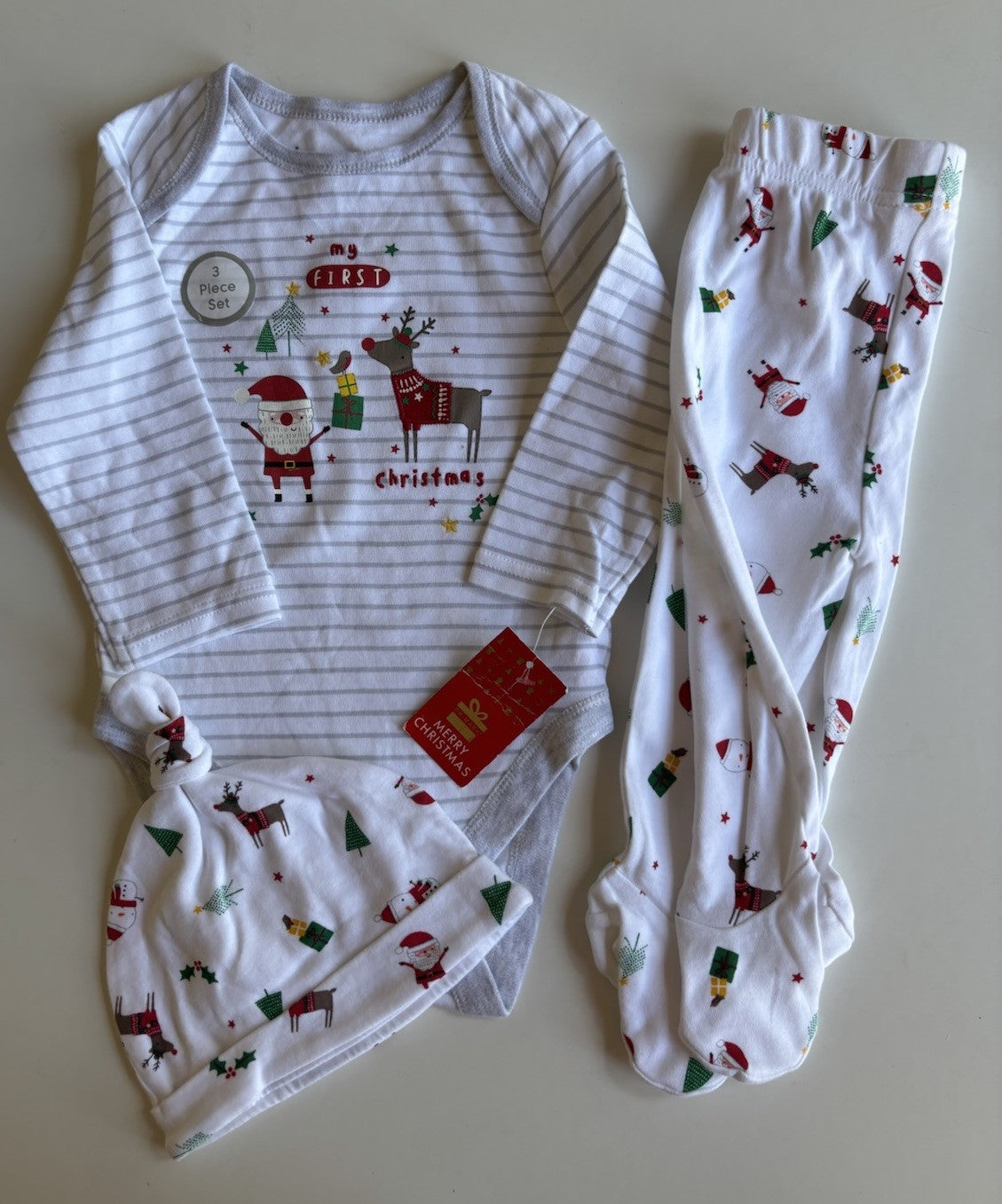 Primark baby size 6-9 months white leggings top beanie Christmas set, BNWT