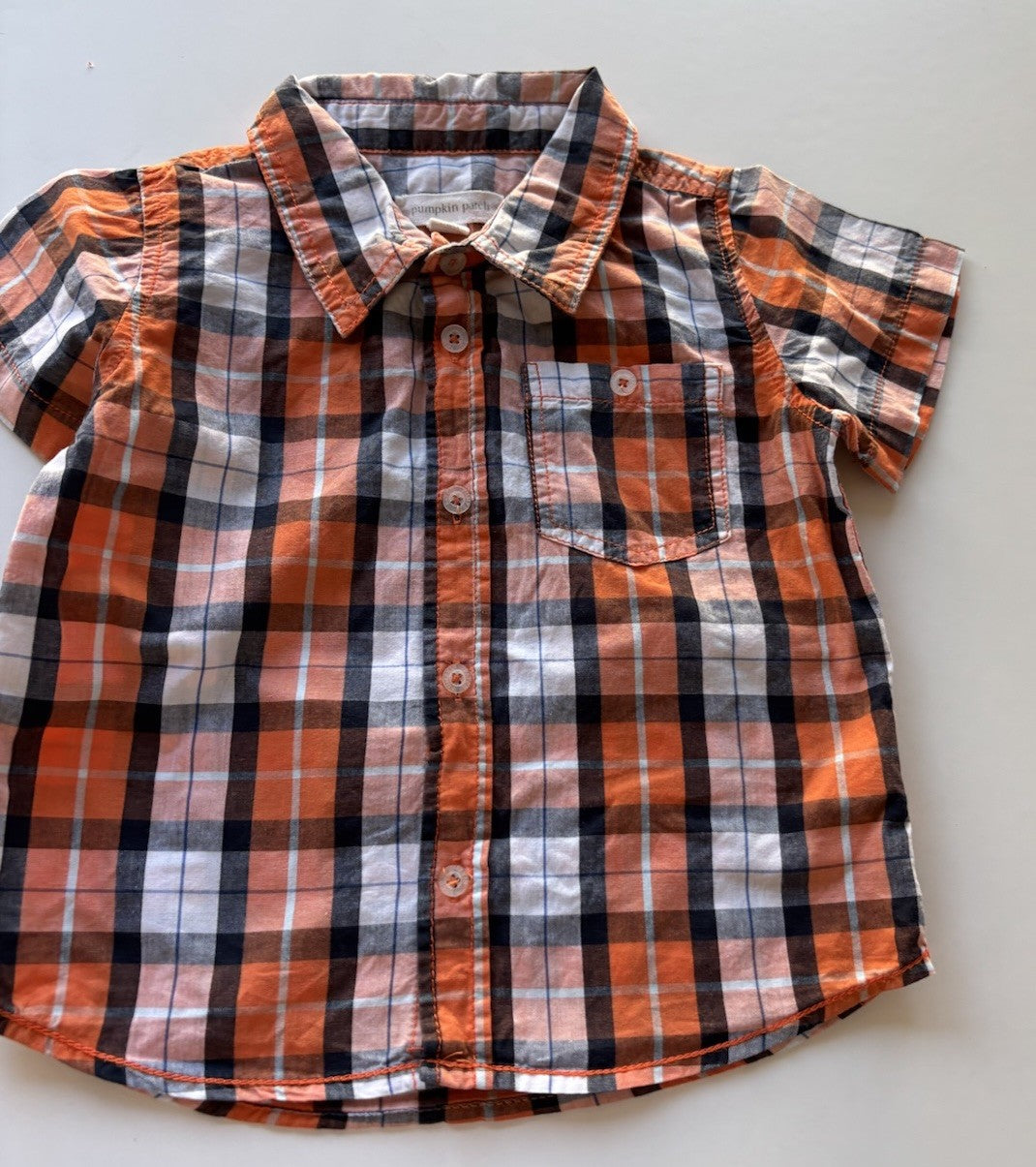 Pumpkin Patch baby boy size 12-18 months orange blue check button up shirt, VGUC