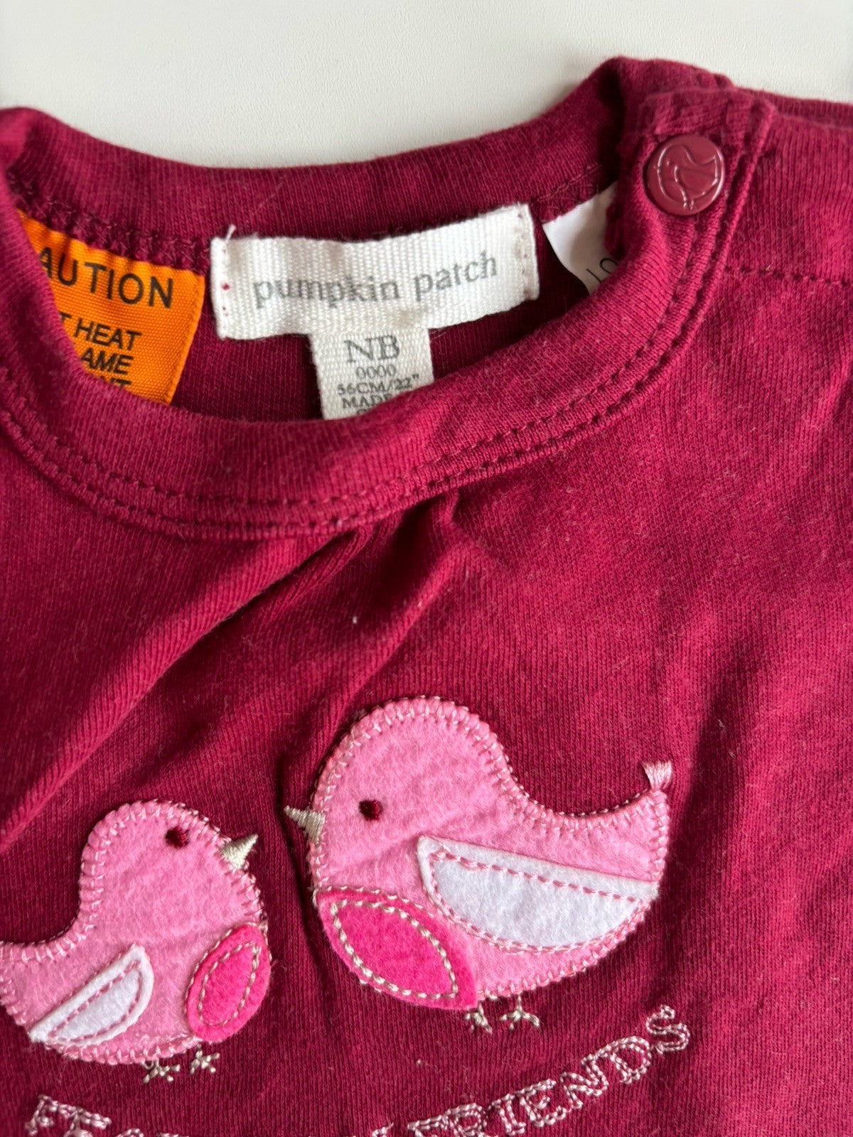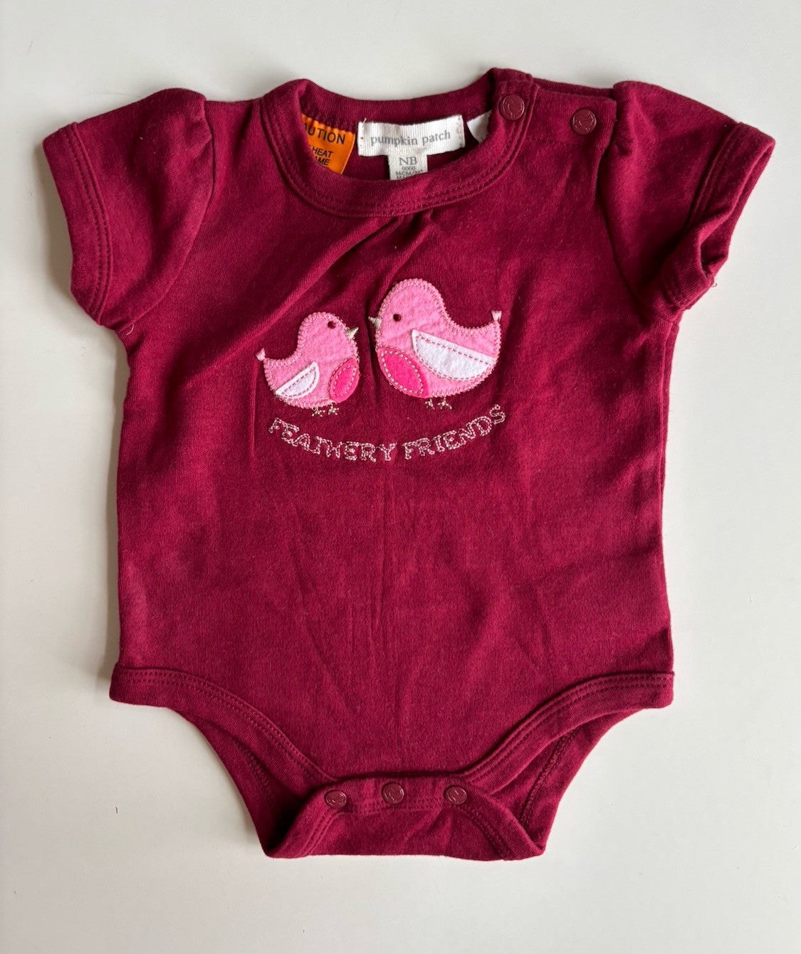 Pumpkin Patch baby girl size newborn maroon birds bodysuit, VGUC