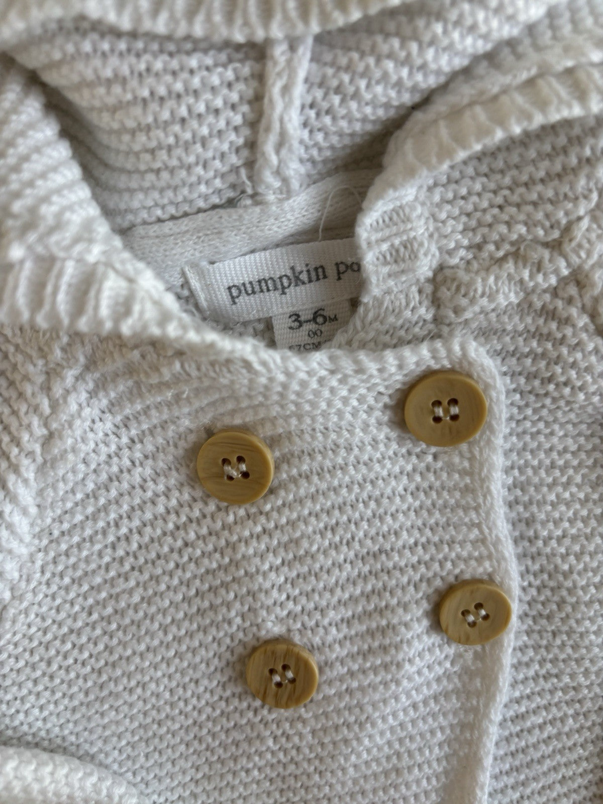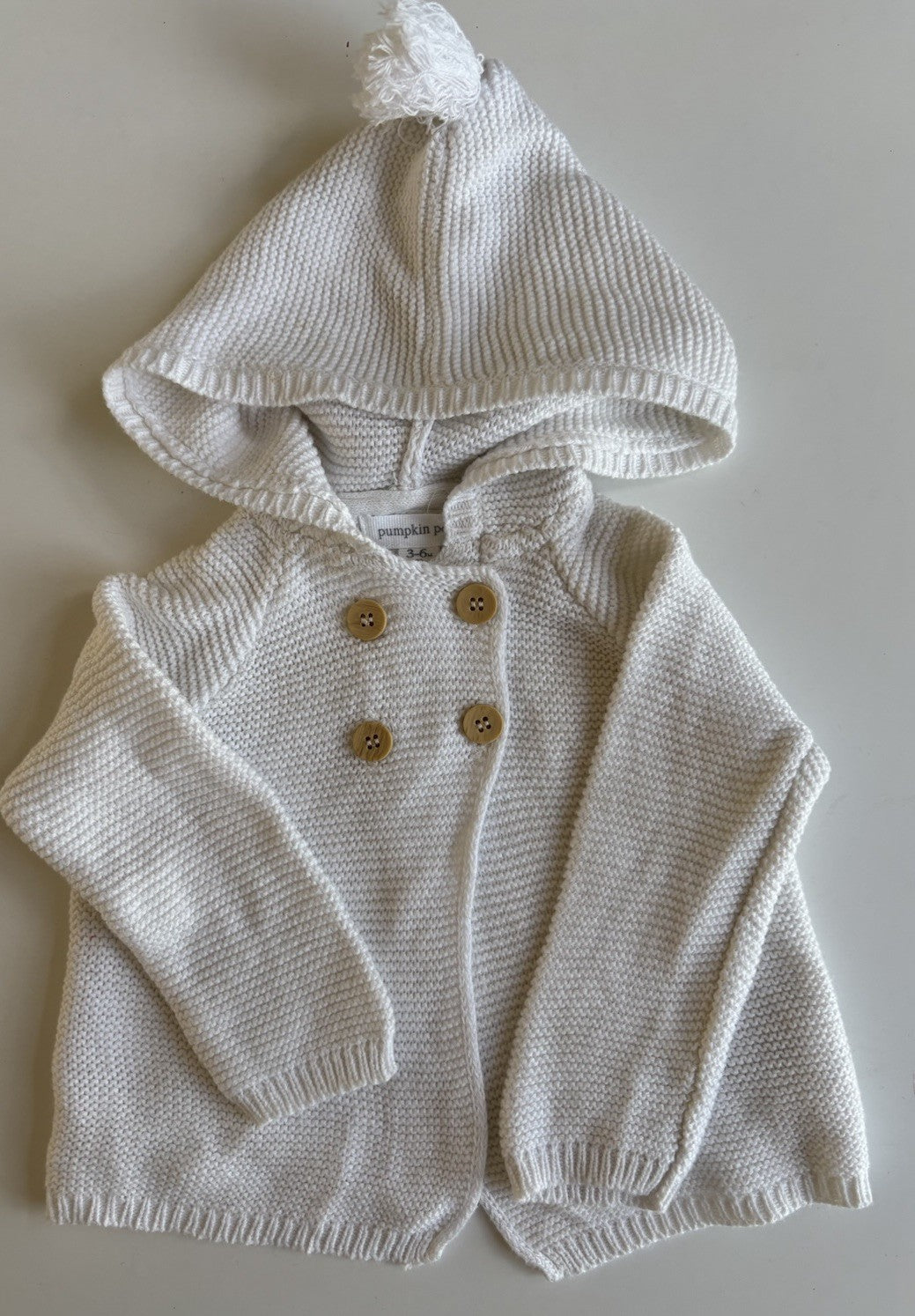 Pumpkin Patch baby size 3-6 months white knit cardigan hood, VGUC