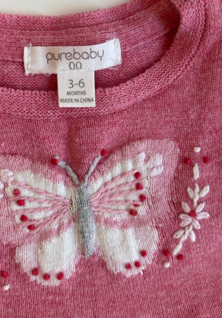 Purebaby baby girl size 3-6 months pink knitted butterfly dress, VGUC