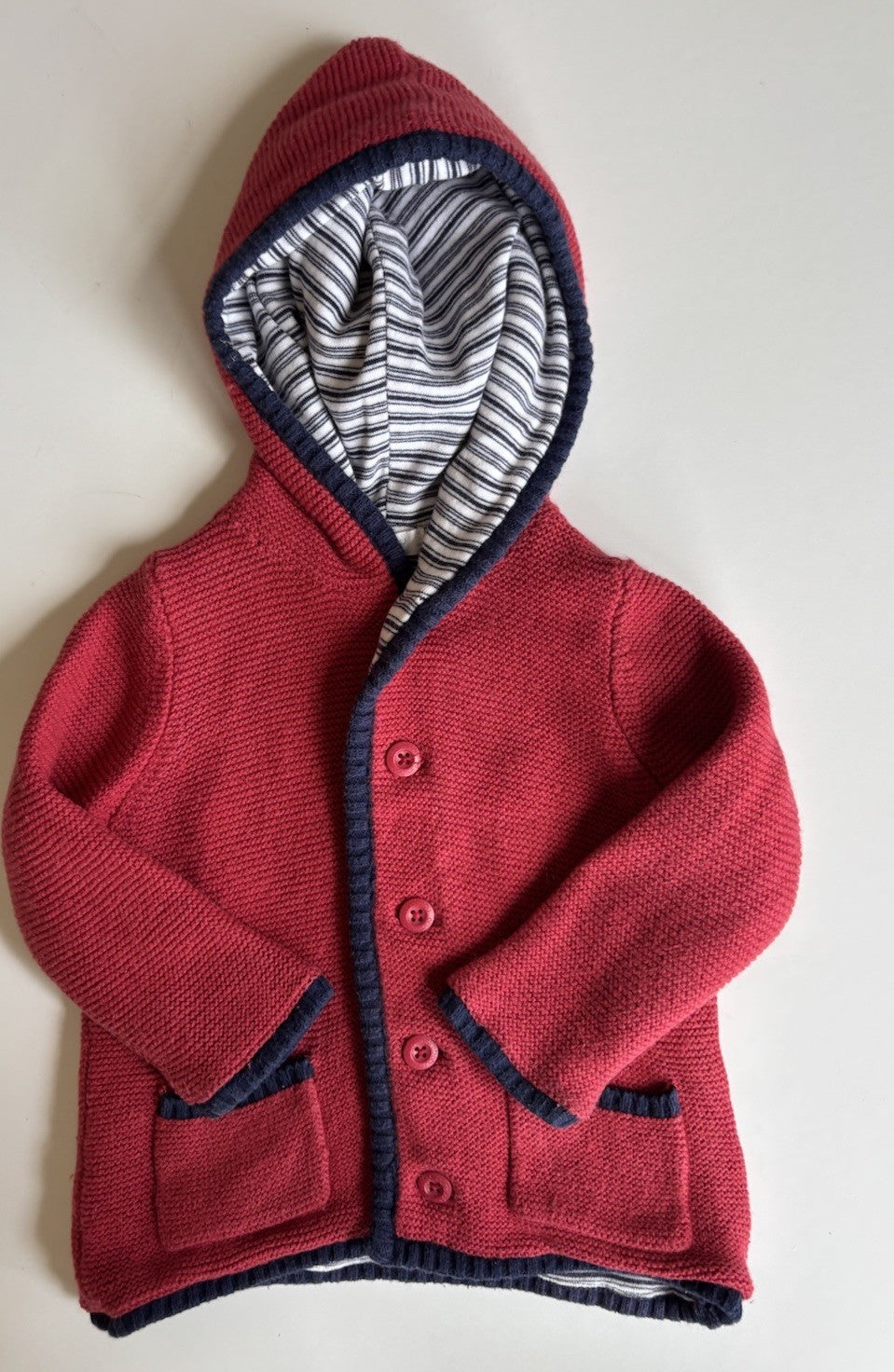 Purebaby baby size 12-18 months red knitted button up cardigan hood, VGUC