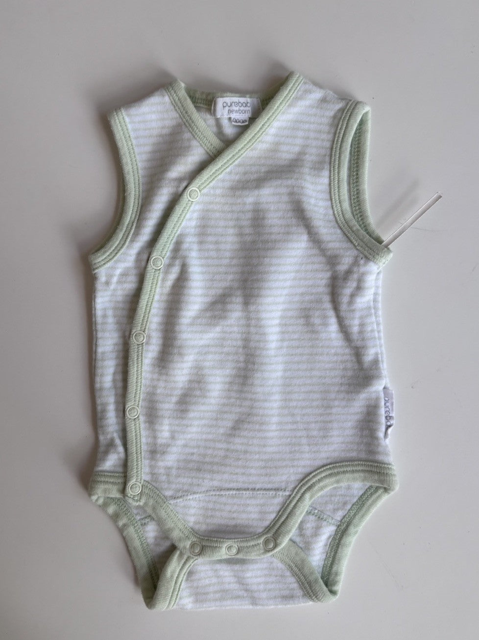Purebaby baby size newborn green white stripe wrap bodysuit tank, VGUC
