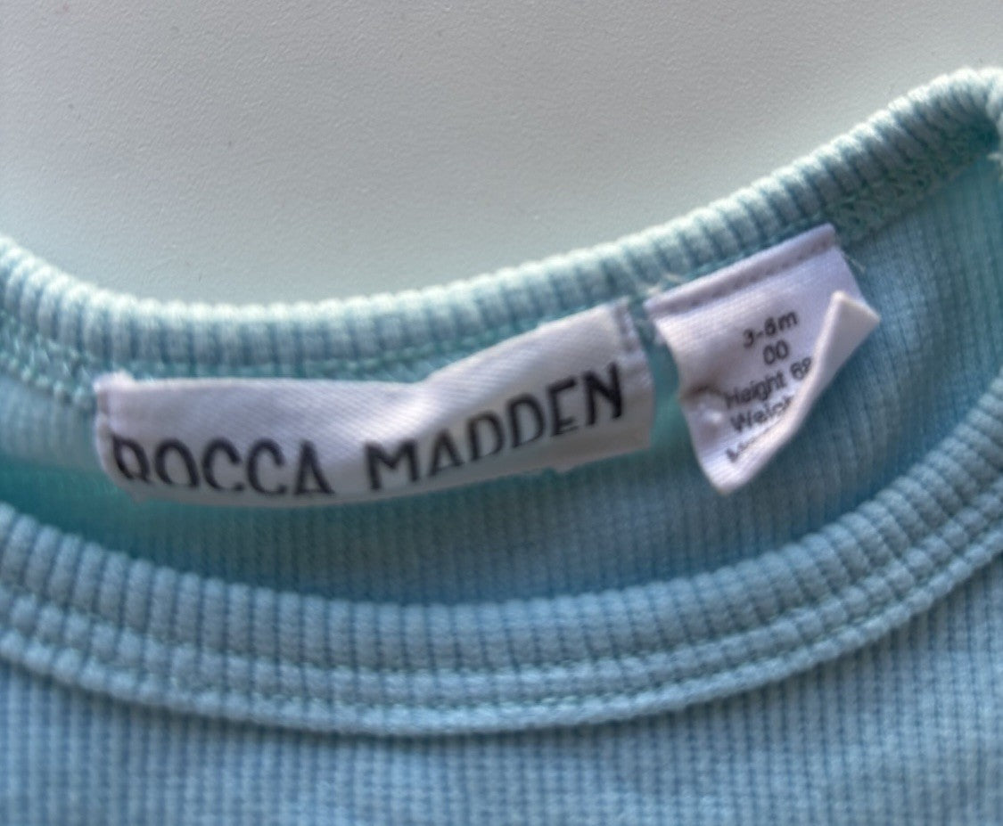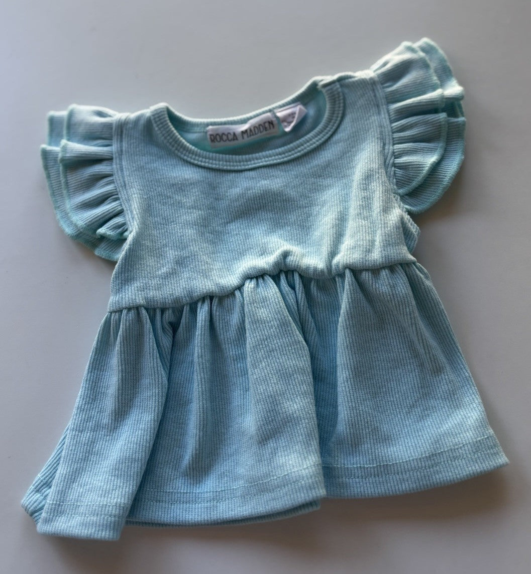 Rocca Madden baby girl size 3-6 months blue ribbed flounce top, VGUC