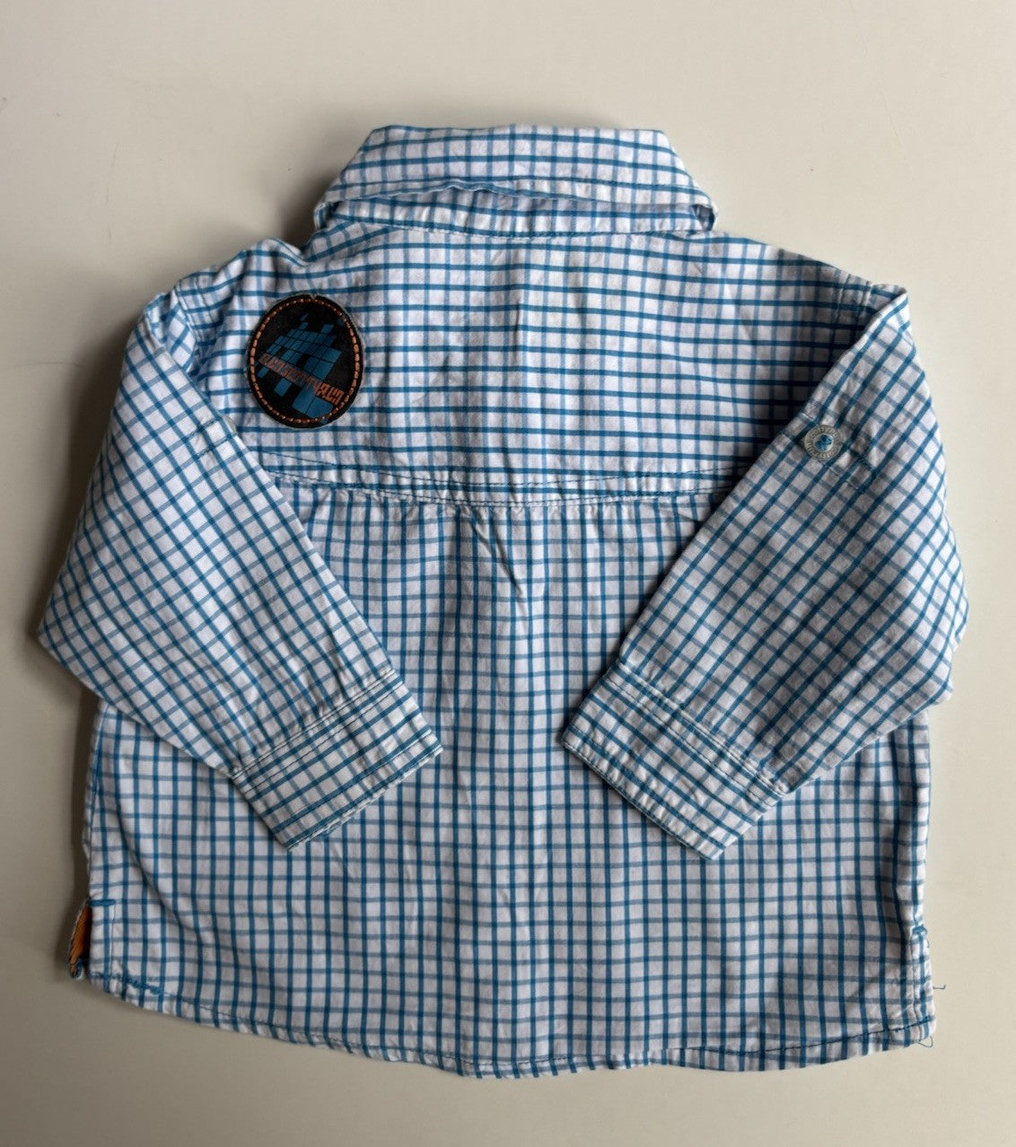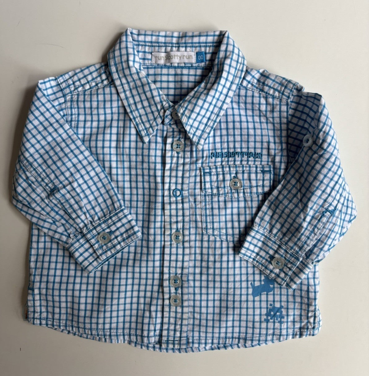 Run Scotty Run baby boy size 3-6 months blue white check shirt, VGUC