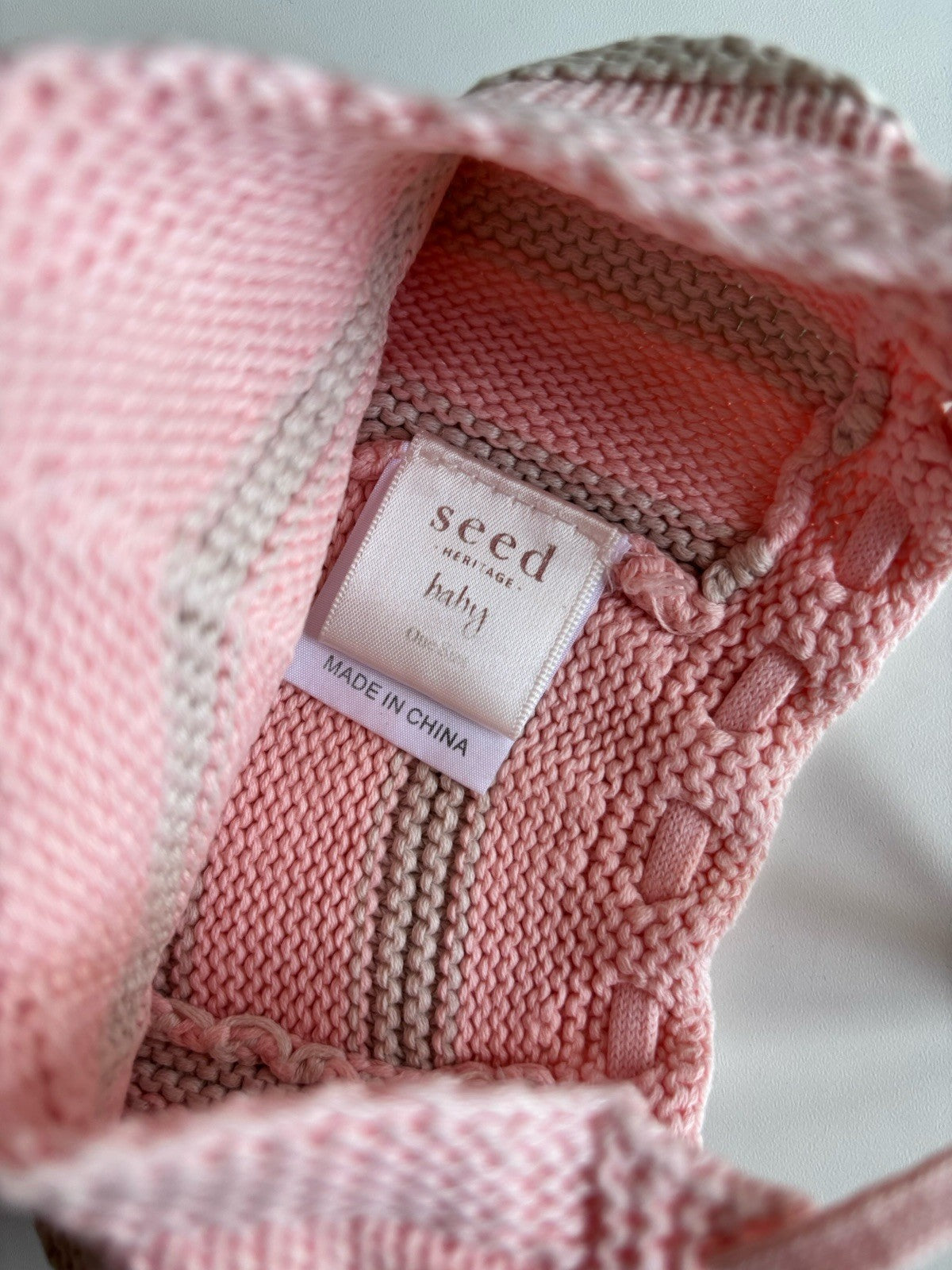 Seed baby girl one size pink grey knitted pom pom beanie hat, GUC