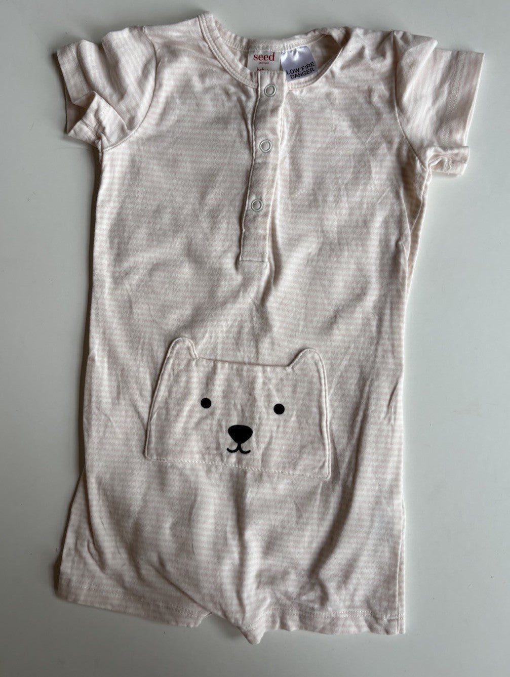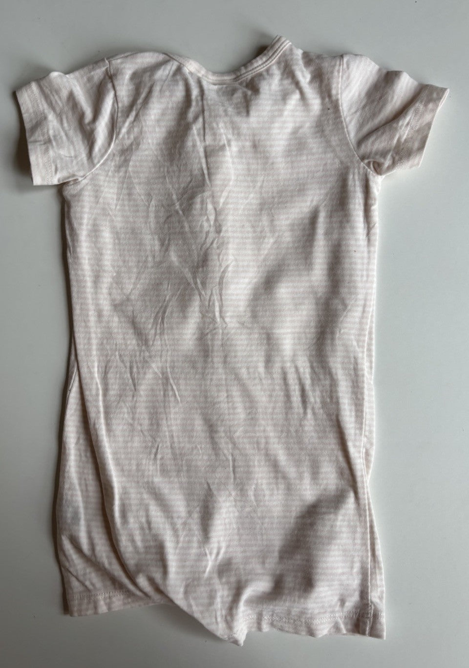Seed baby girl size 12-18 months pink white stripe romper dog pocket, VGUC