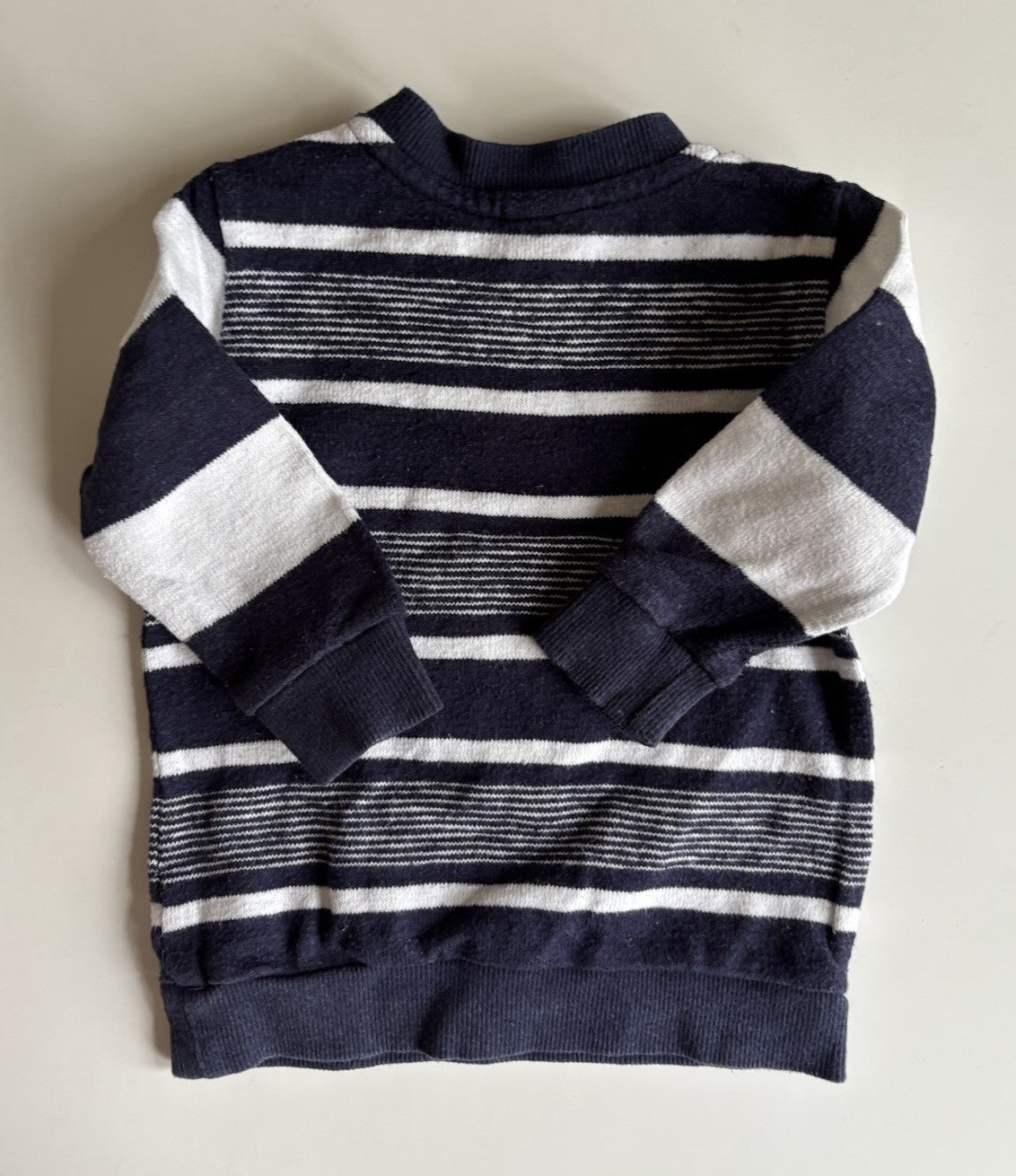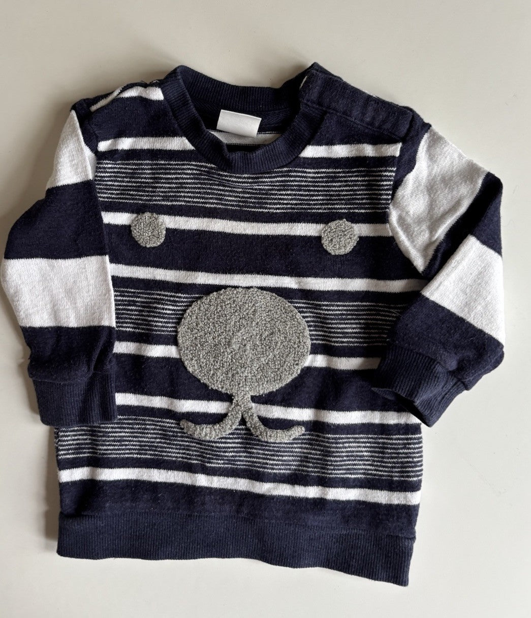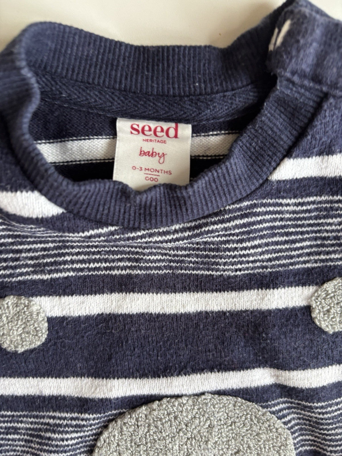 Seed baby size 0-3 months navy blue white stripe jumper face, VGUC