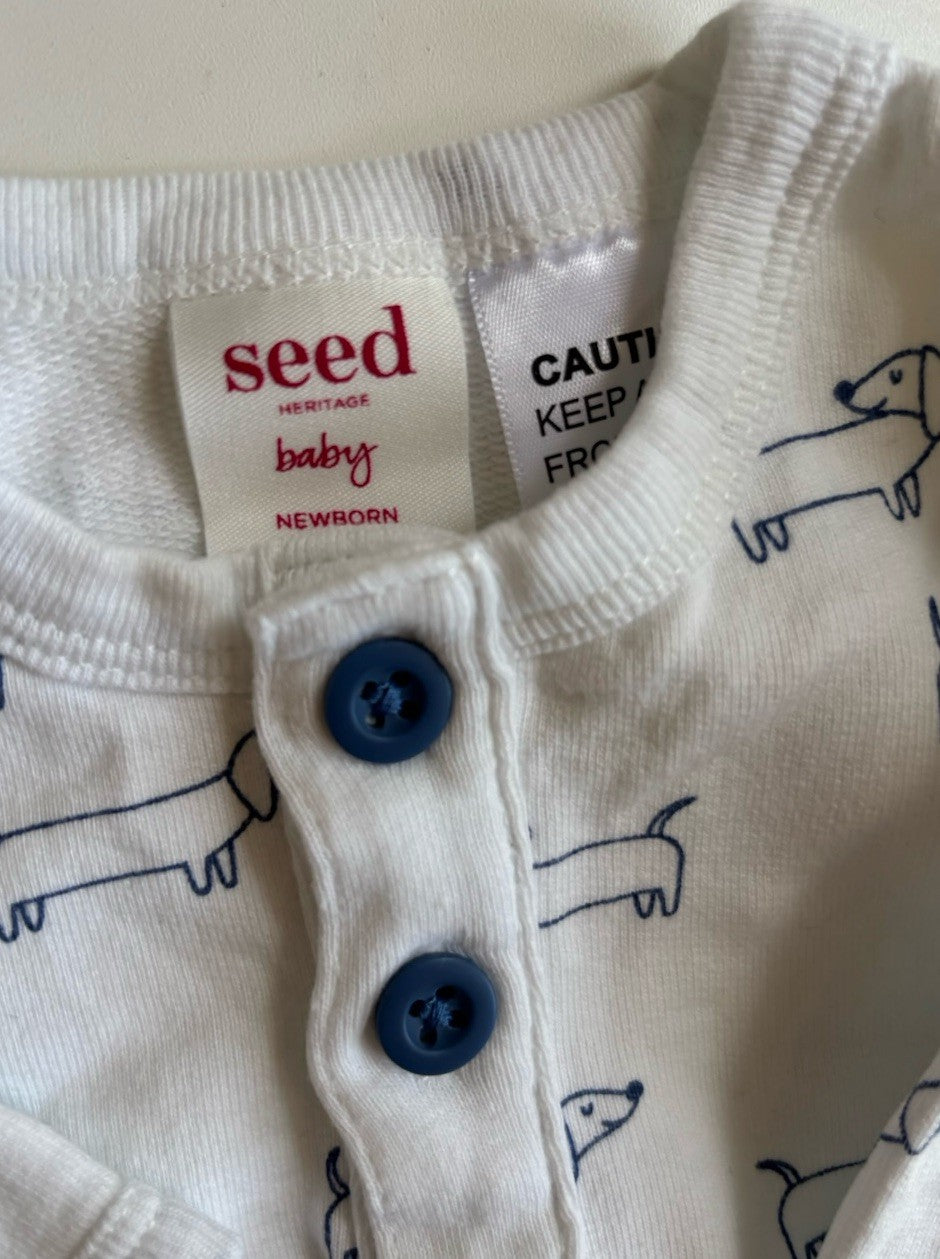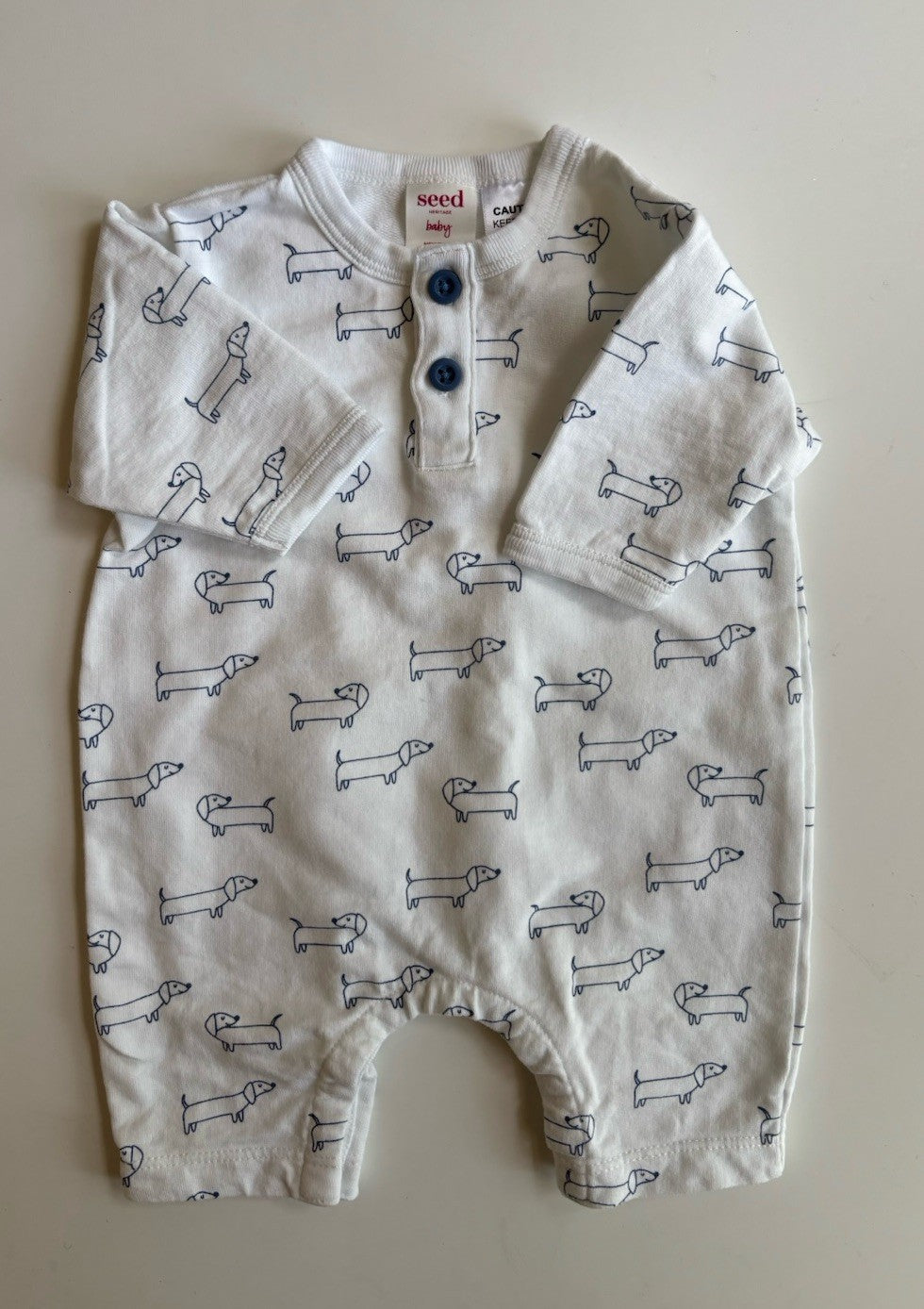 Seed baby size newborn white blue sausage dog one-piece, EUC