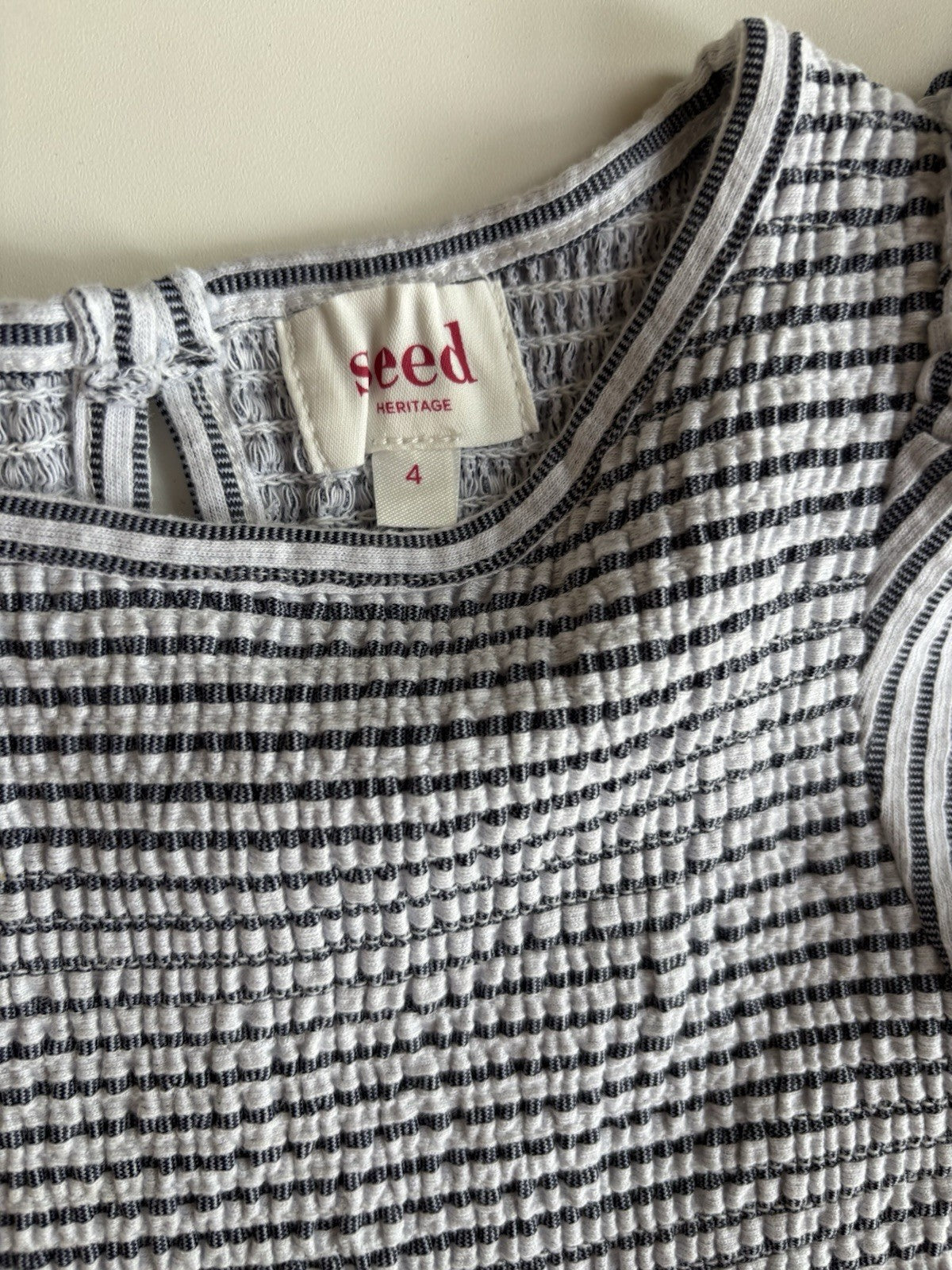 Seed kids girls size 4 blue white stripe smocked short sleeve dress, V