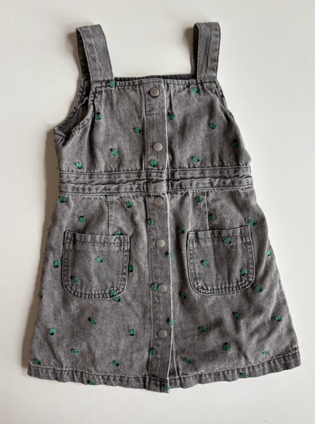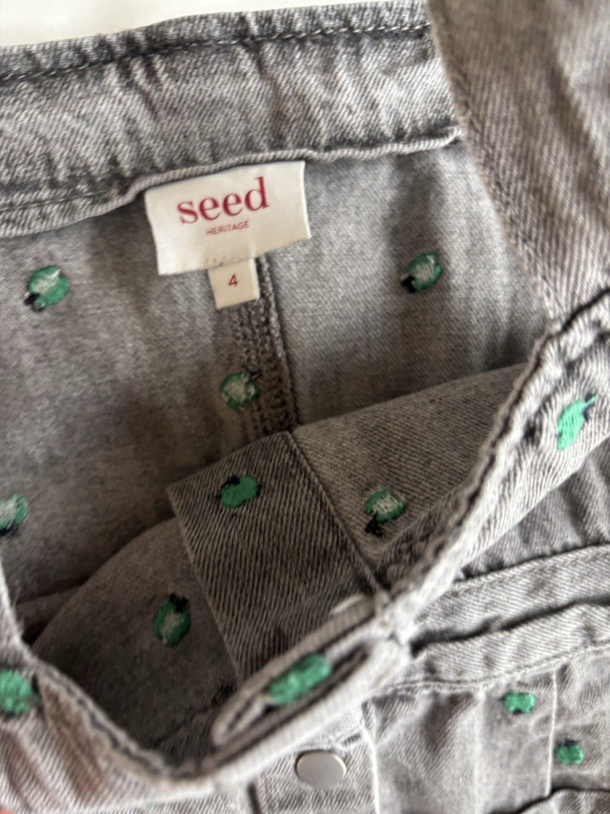 Seed kids girls size 4 grey denim pinafore dress embroidered apples, V