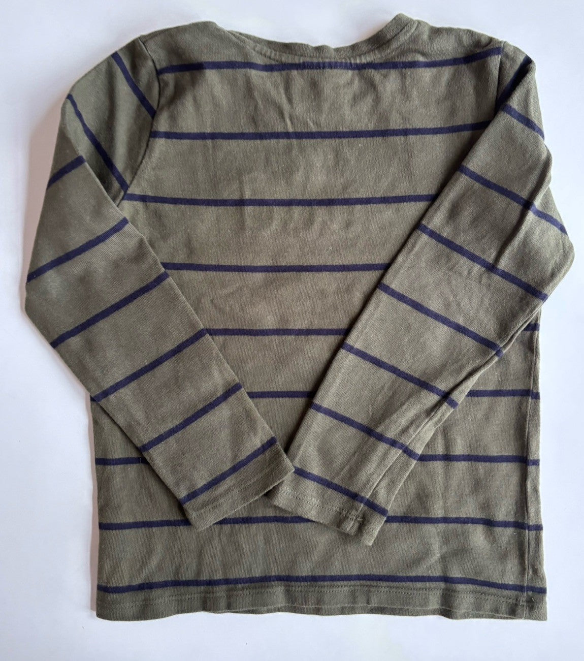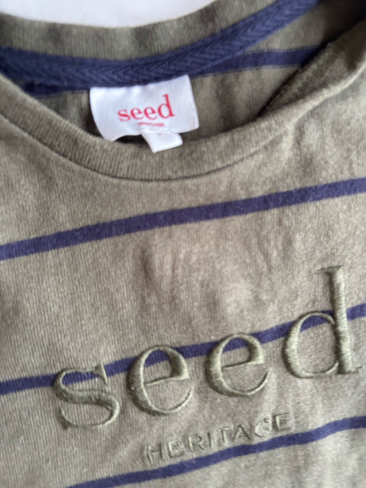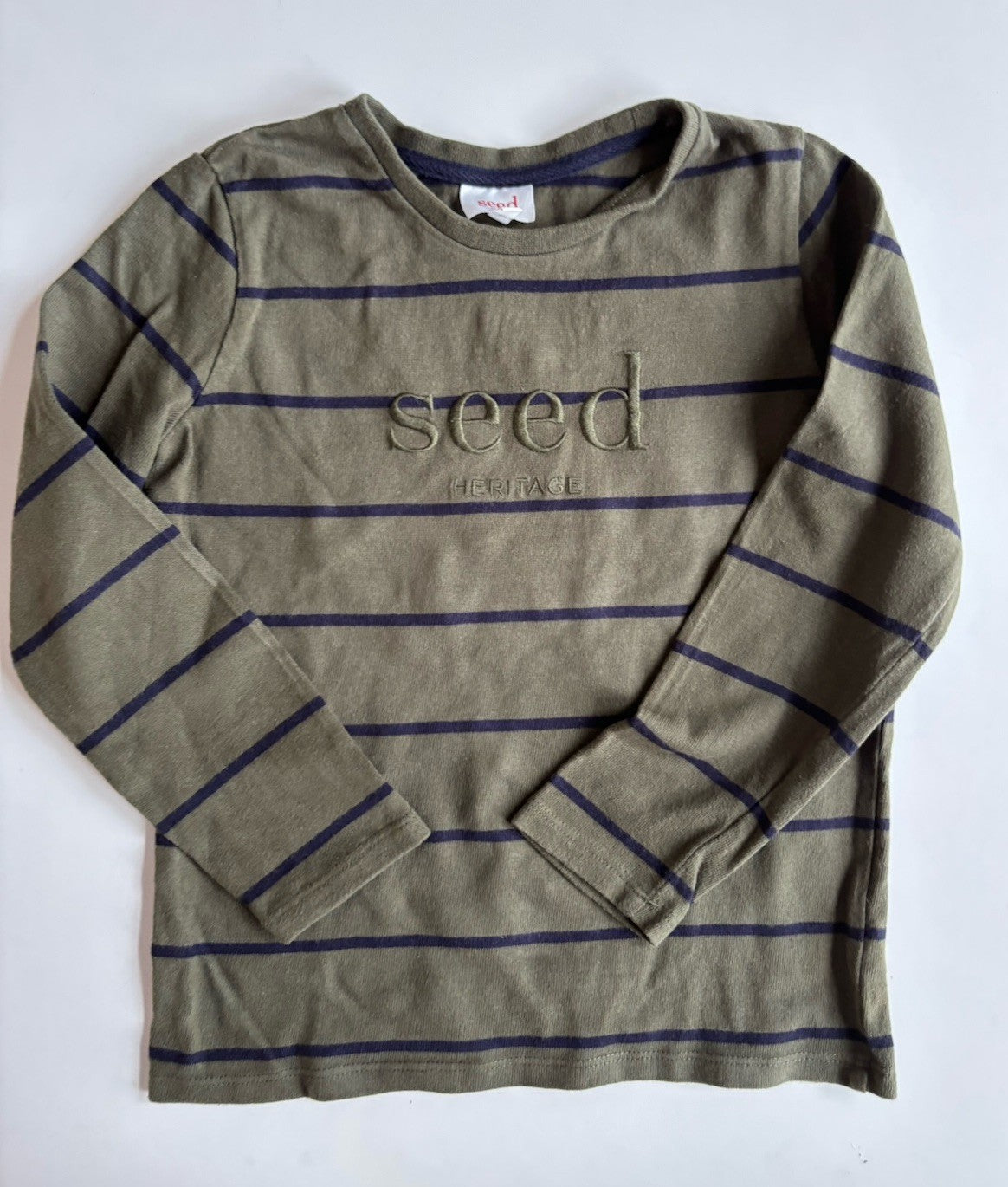 Seed kids size 7 green navy blue stripe logo long sleeve t-shirt, VGUC