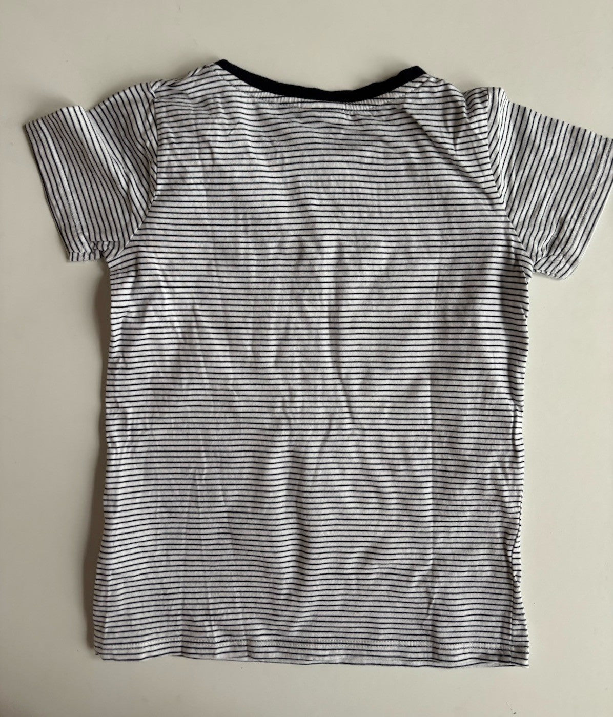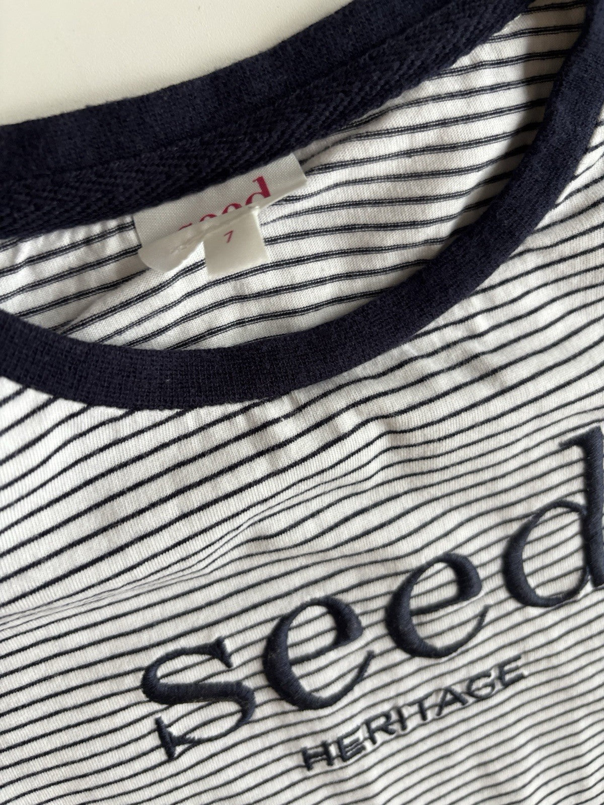 Seed kids size 7 navy blue white stripe logo short sleeve t-shirt, VGUC