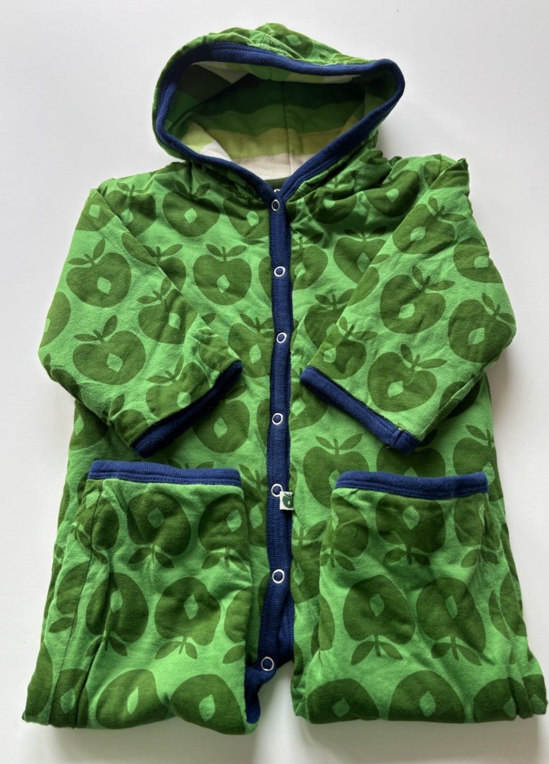 Smafolk baby size 68 (3-6 months) green apples thick one-piece hood scandi, VGUC