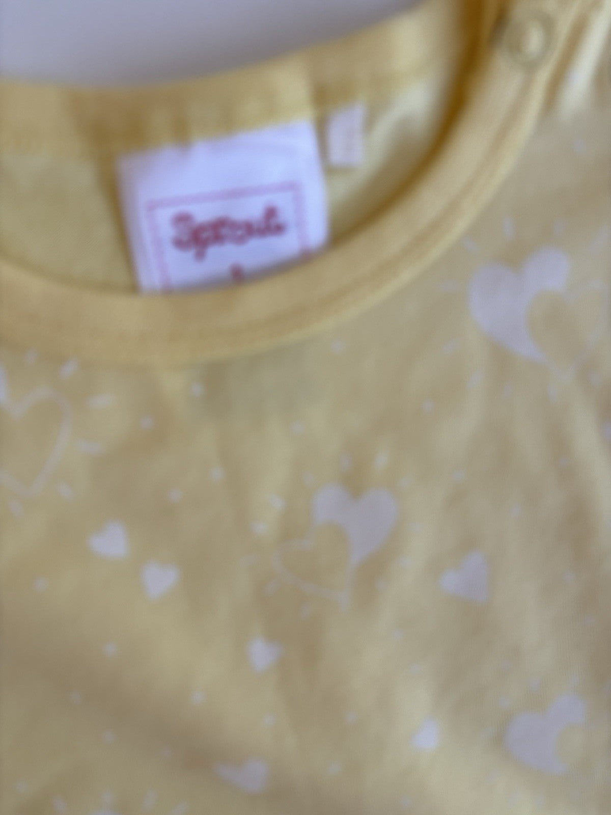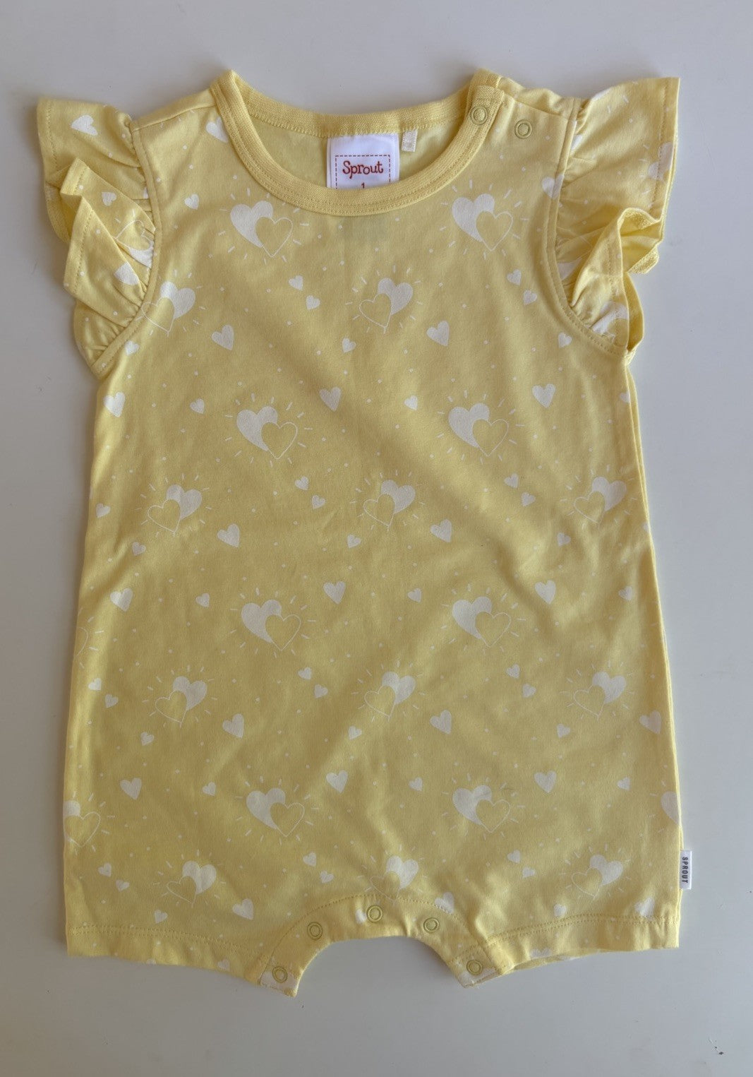 Sprout baby girl size 12-18 months yellow white hearts romper, VGUC