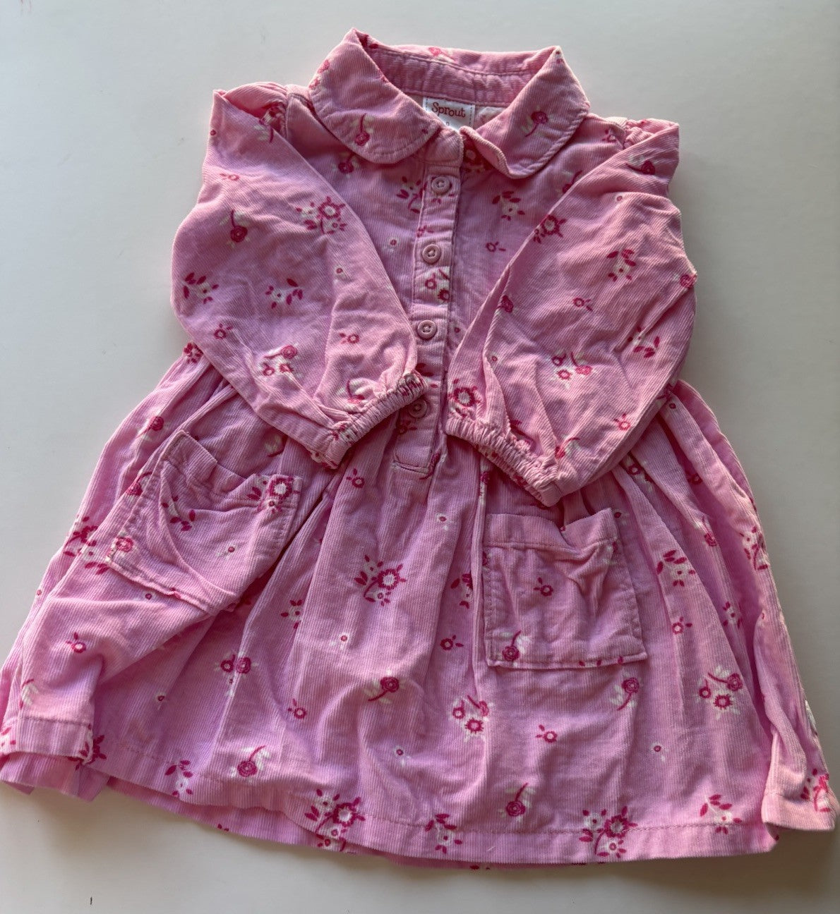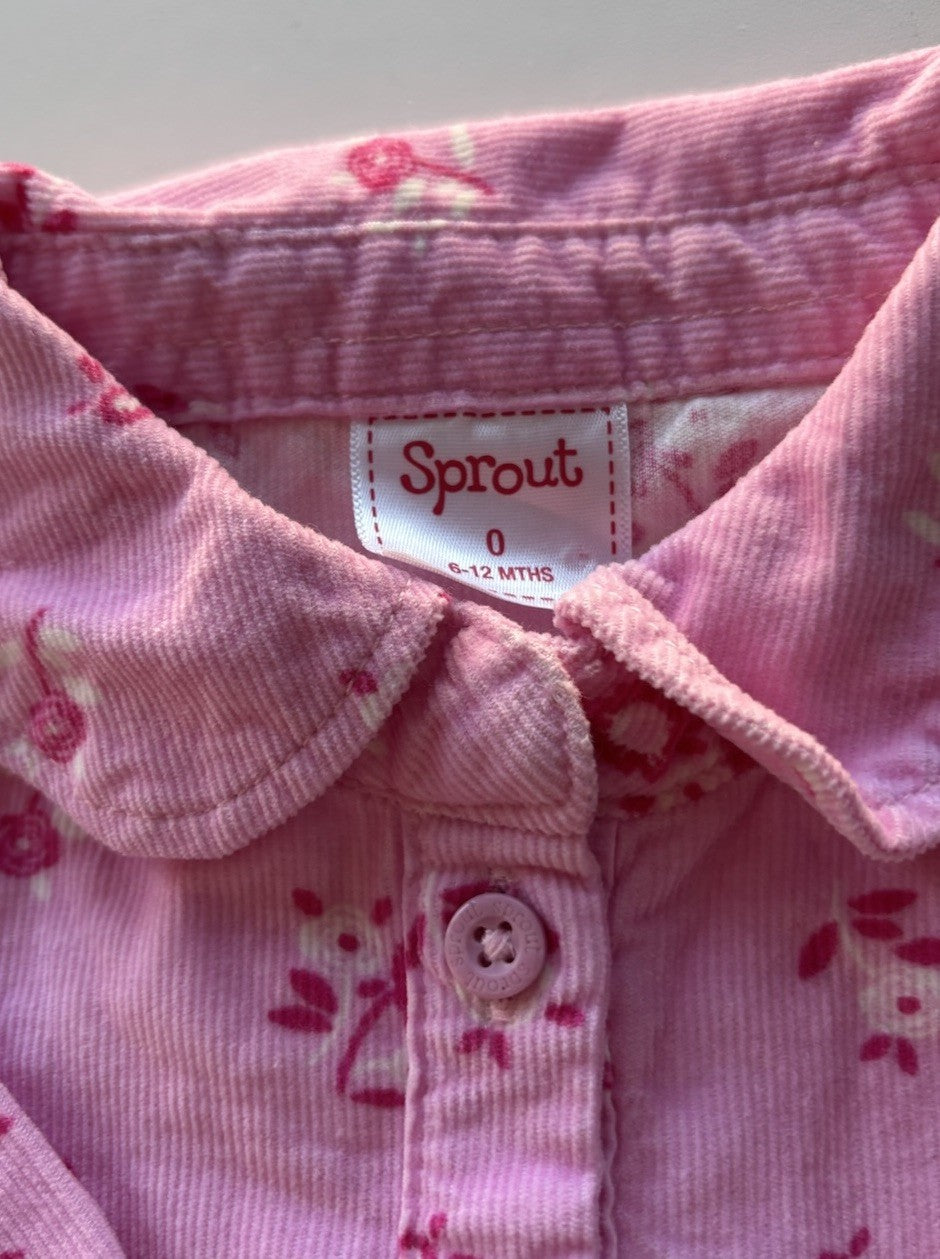 Sprout baby girl size 6-12 months pink cord floral shirt dress, VGUC