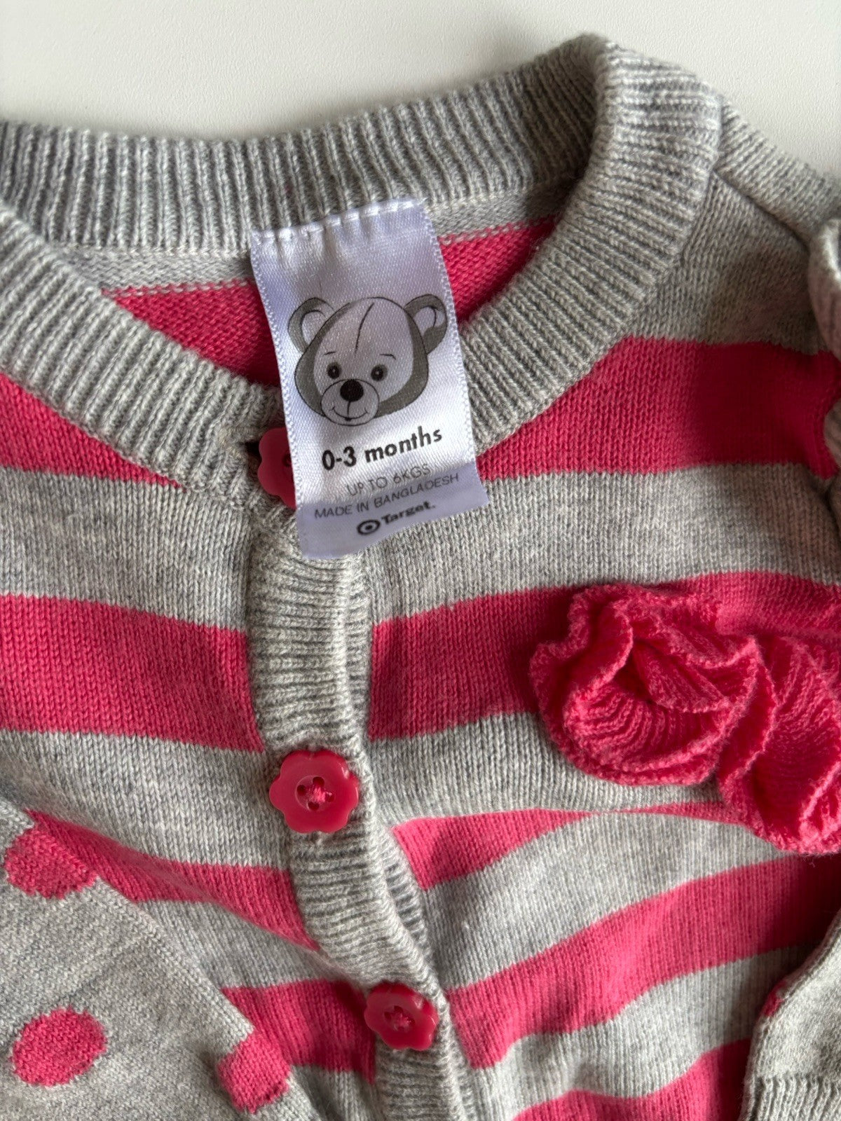 Target baby girl size 0-3 months pink grey knitted stripe cardigan, VGUC