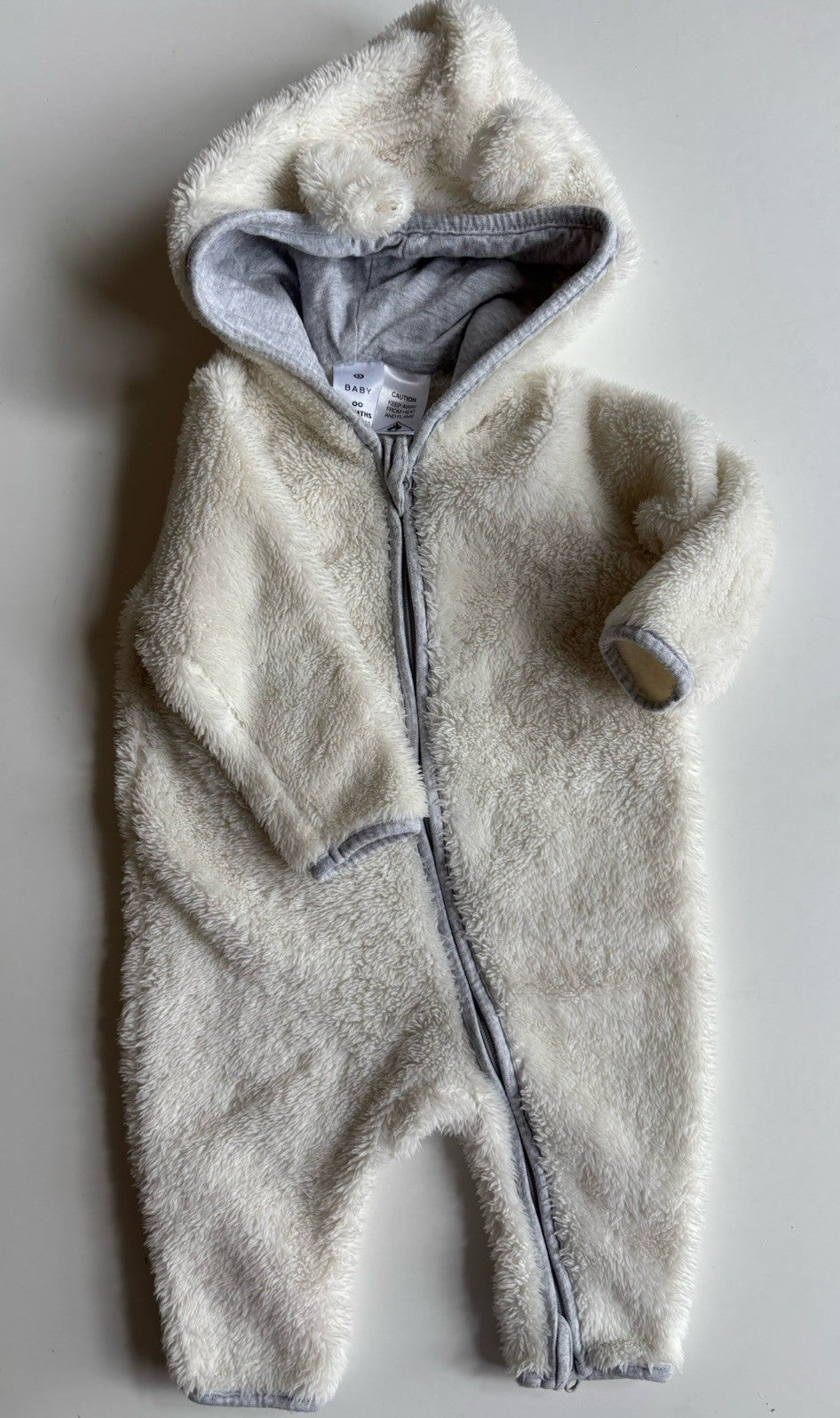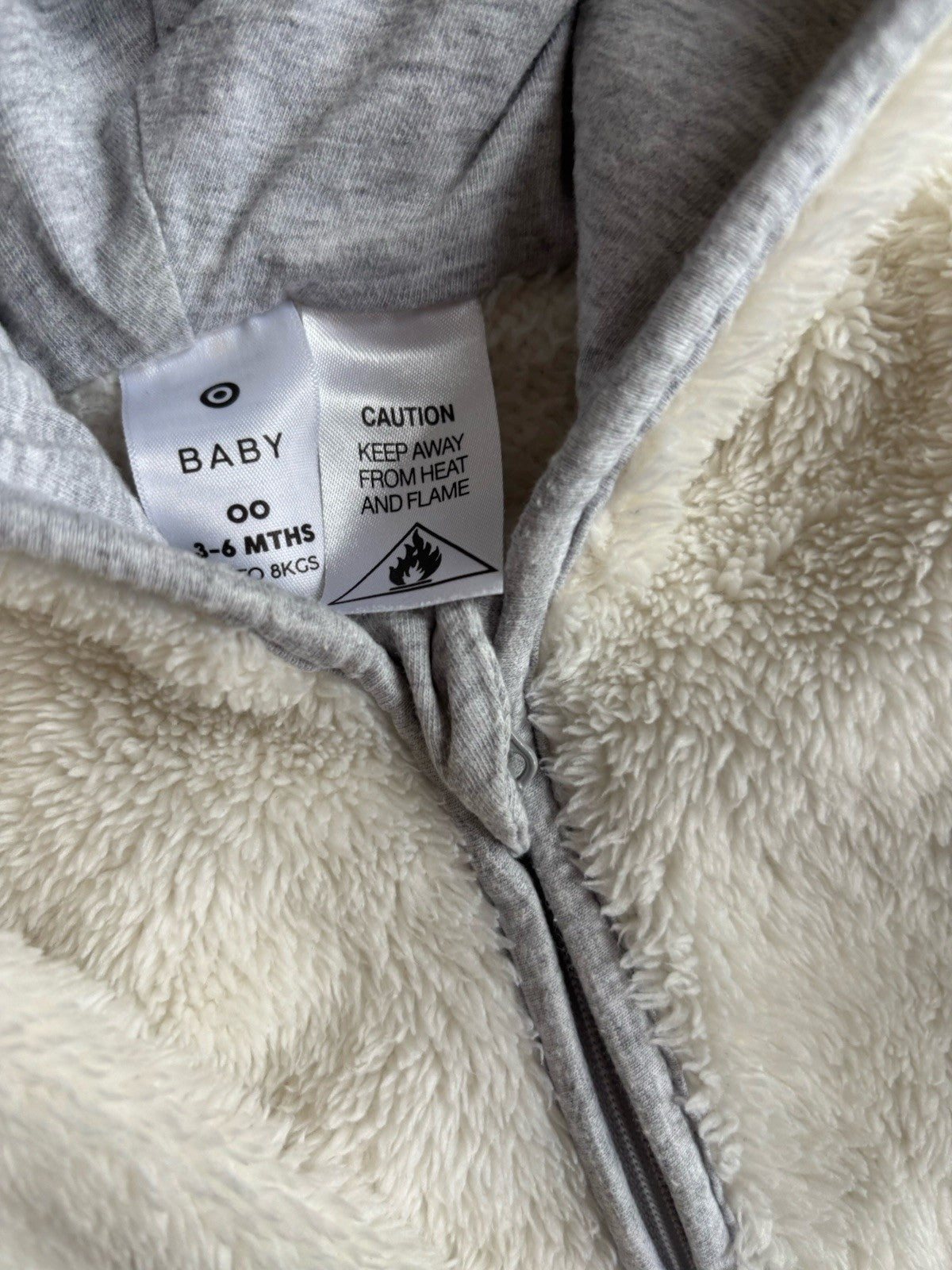 Target baby size 3-6 months white fluffy hooded one-piece, VGUC