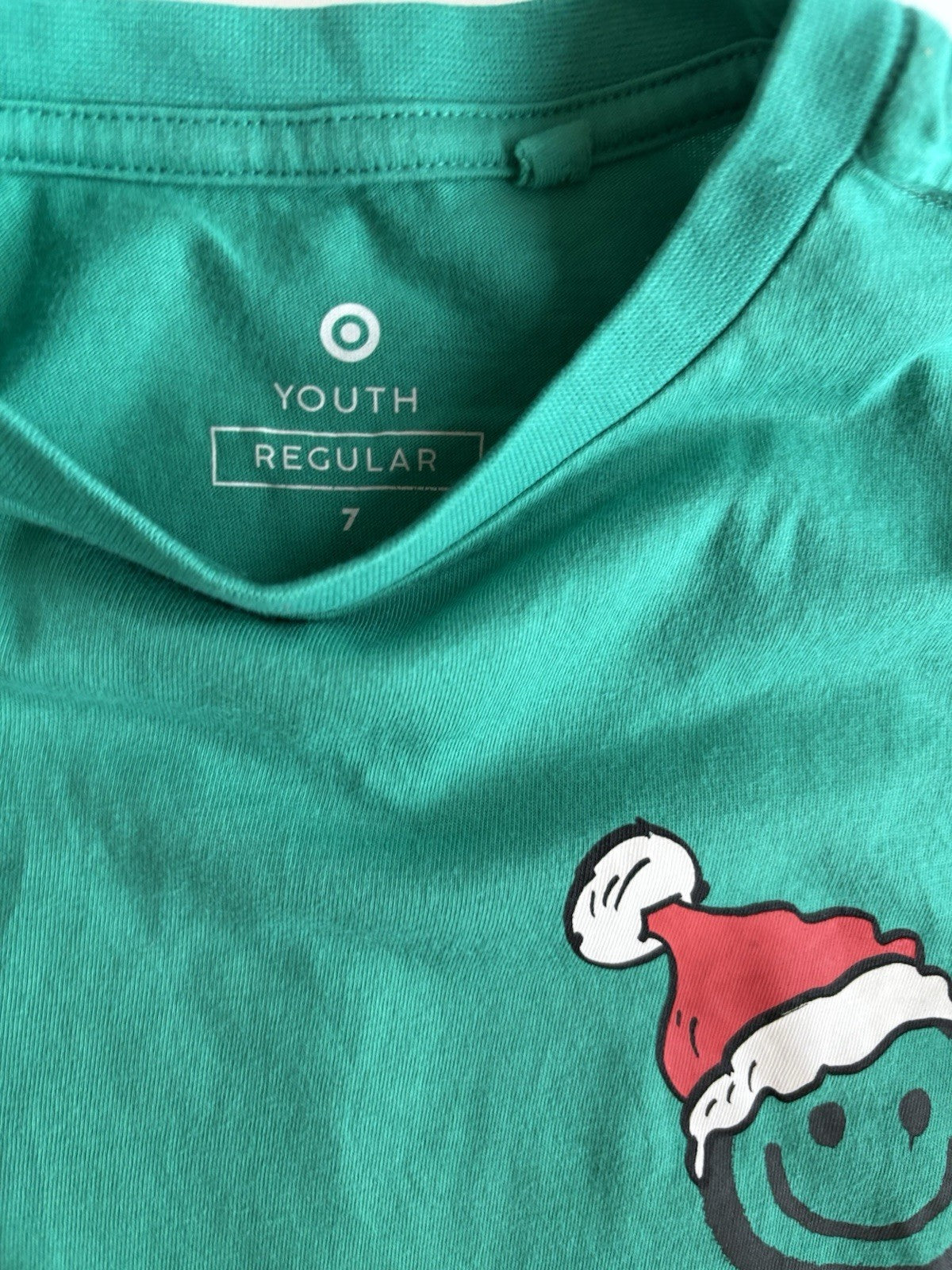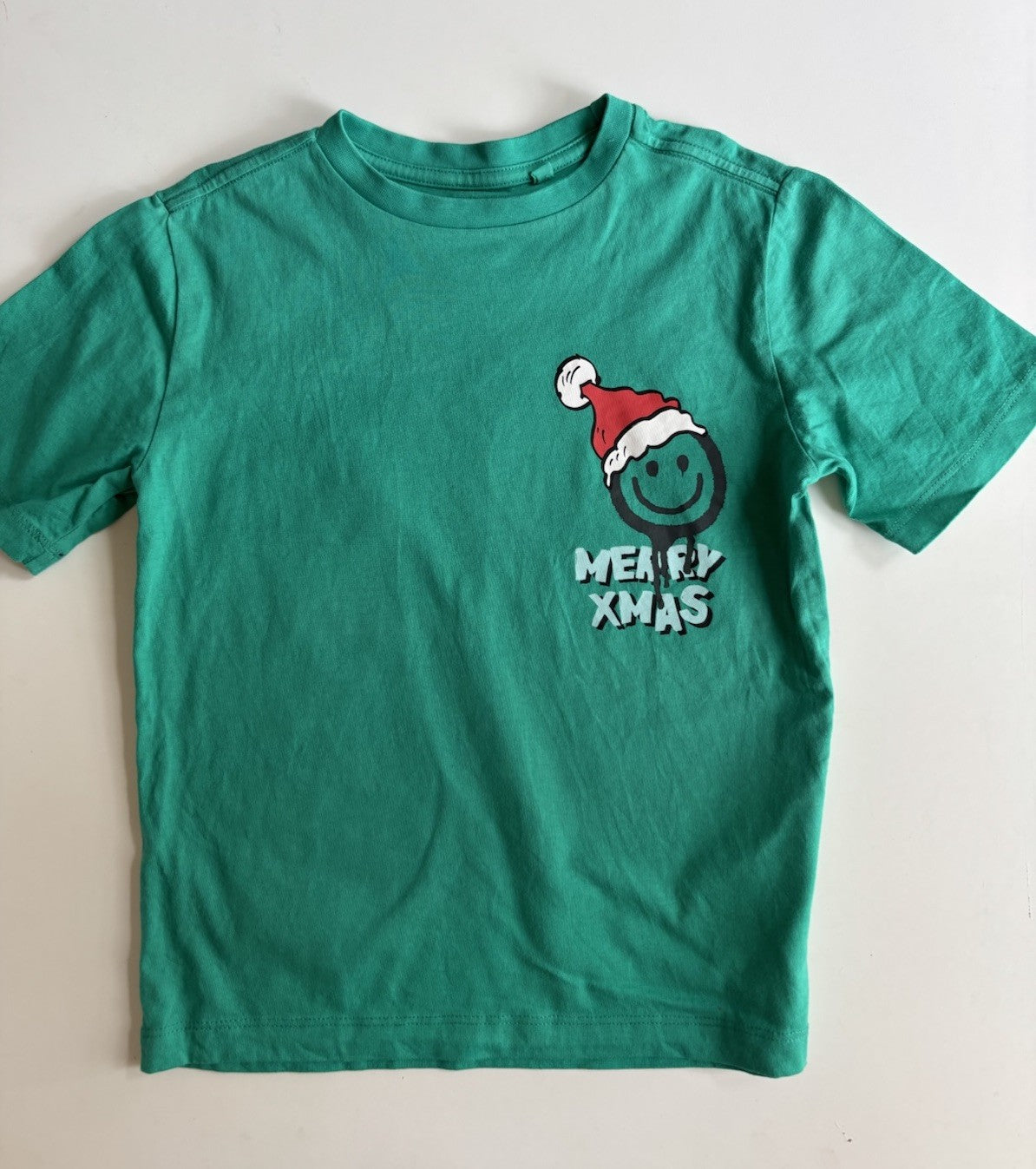 Target kids size 7 green short sleeve Christmas tshirt happy face, VGUC