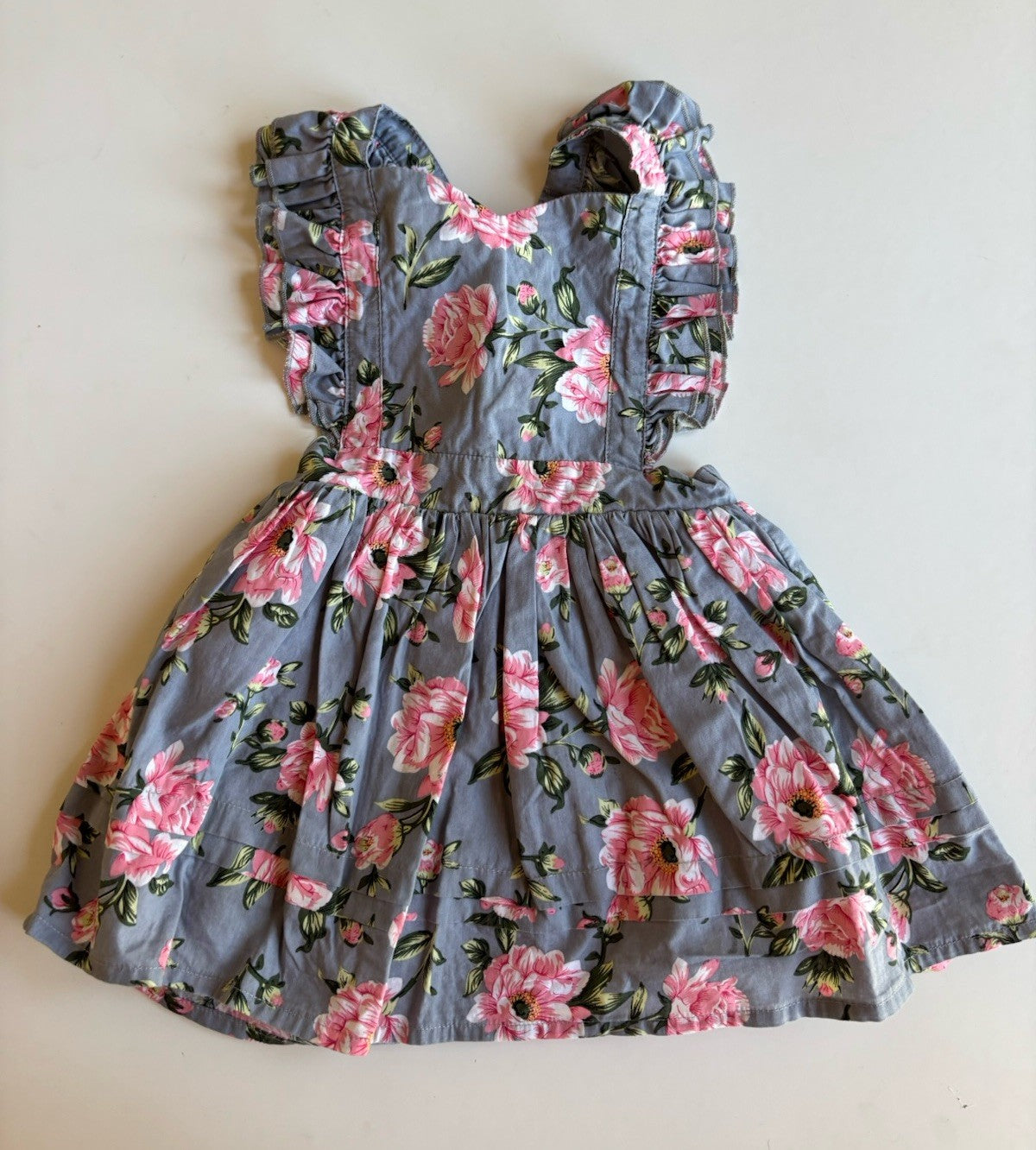 Toots Kids baby girl size 12-18 months blue pink floral pinafore dress, VGUC