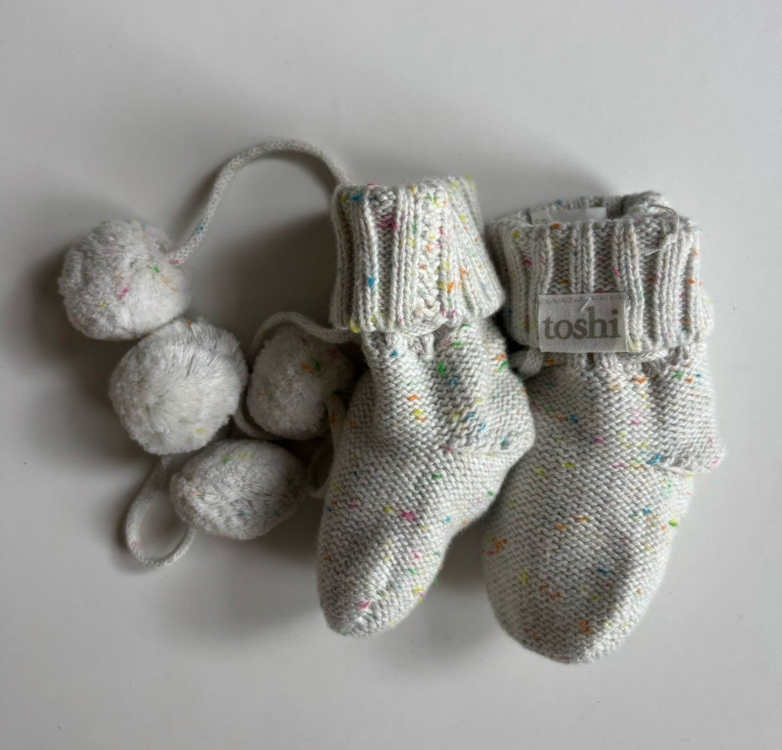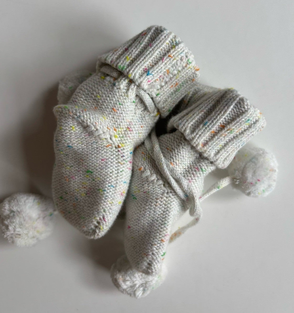 Toshi baby size 0-3 months white colourful speckled knit booties, EUC