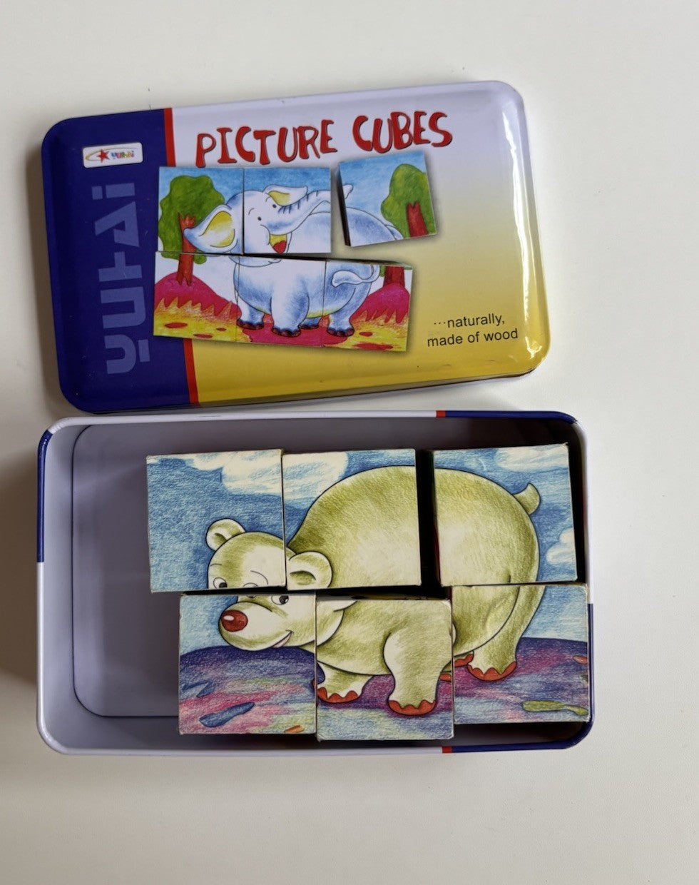Unbranded kids toddler wooden picture cubes in tin animals puzzle, VGU