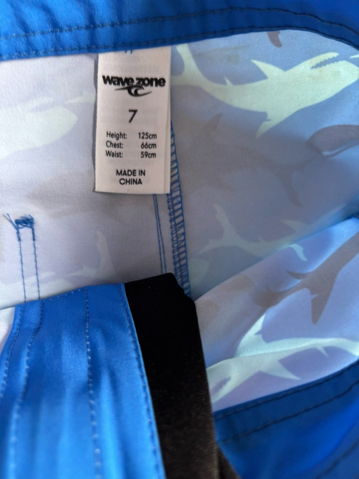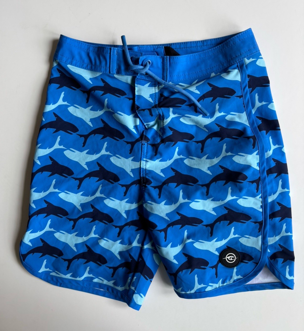 Wave Zone kids boys size 7 blue sharks swimming shorts, VGUC